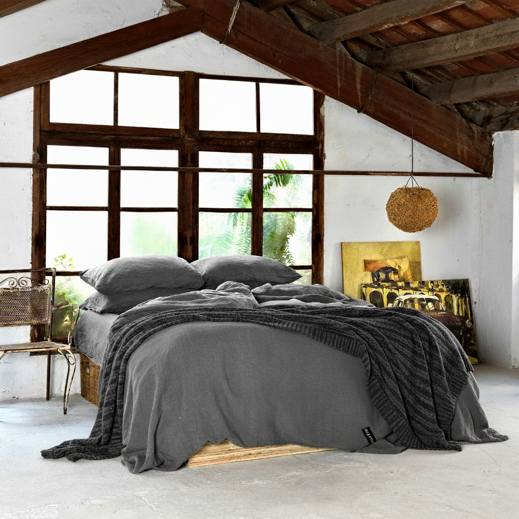 Set of duvet cover, pillowcases and fitted sheet in washed linen. A medium gray ideal for winter