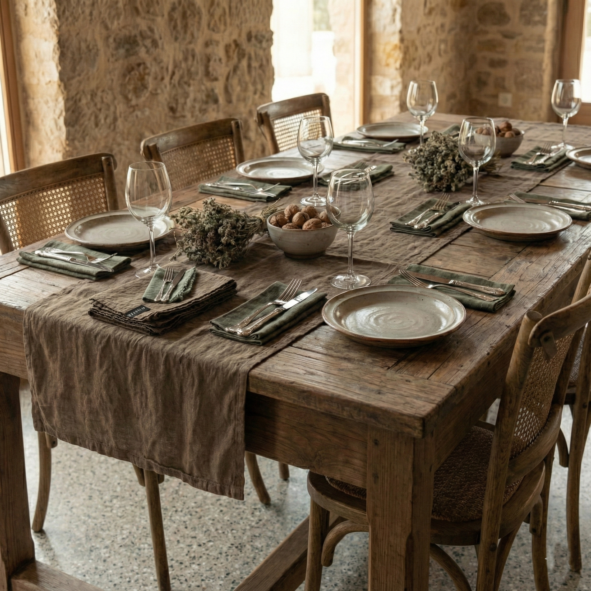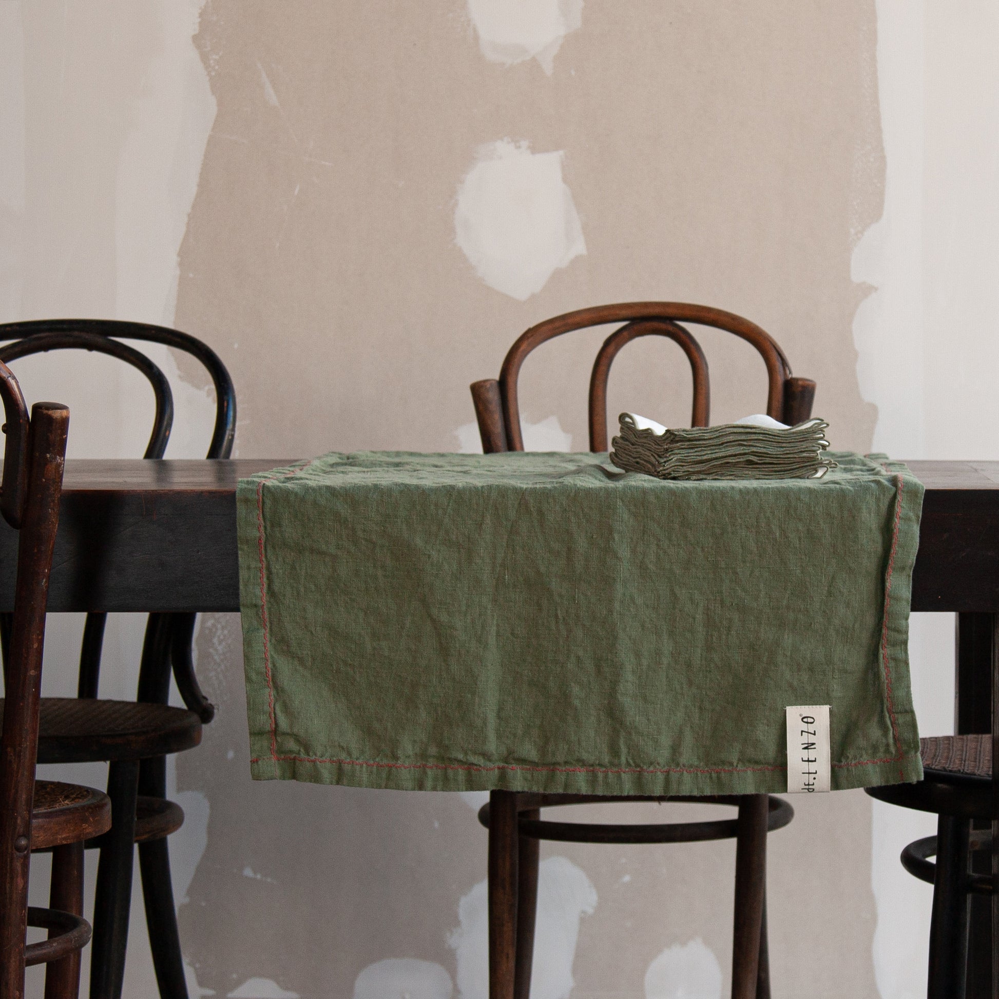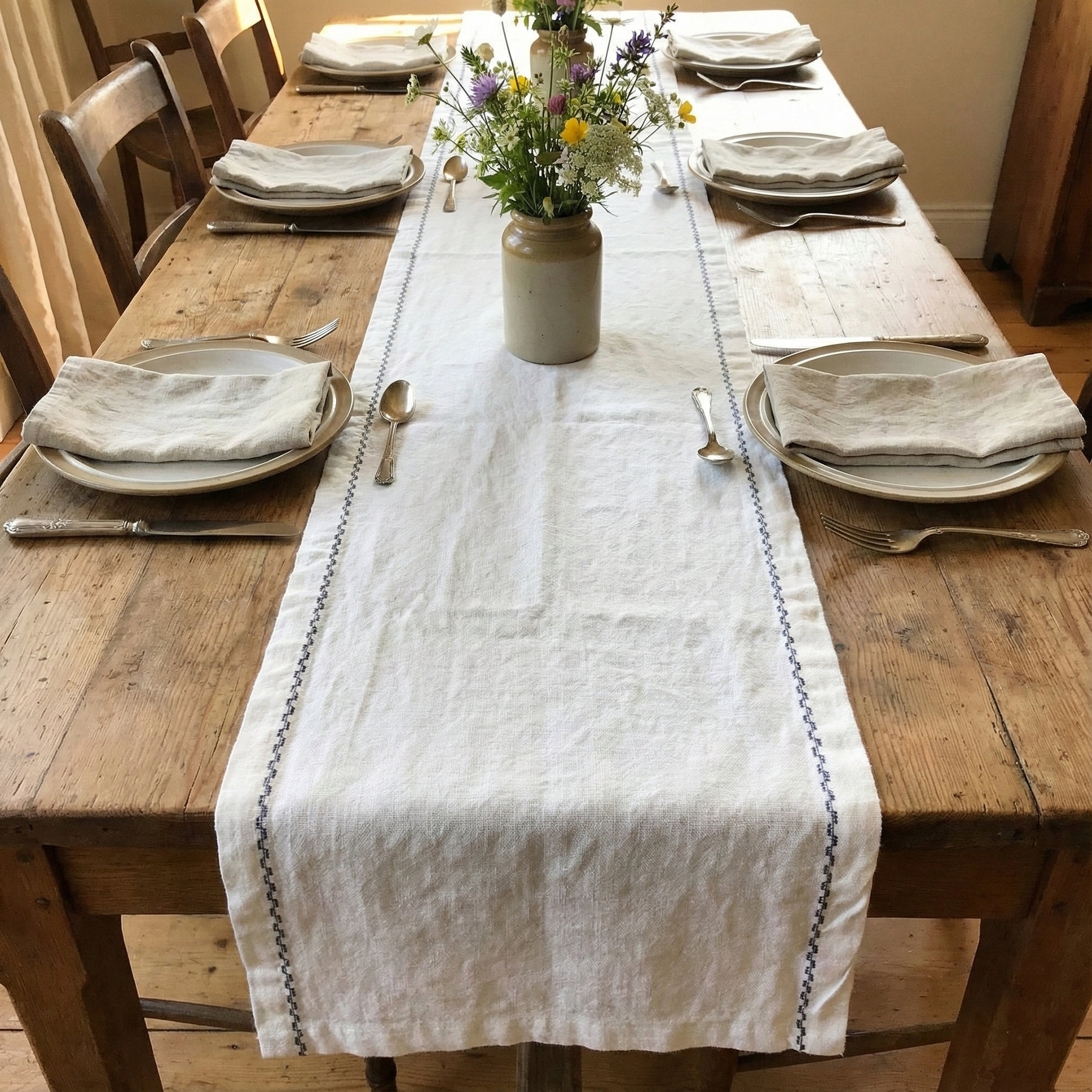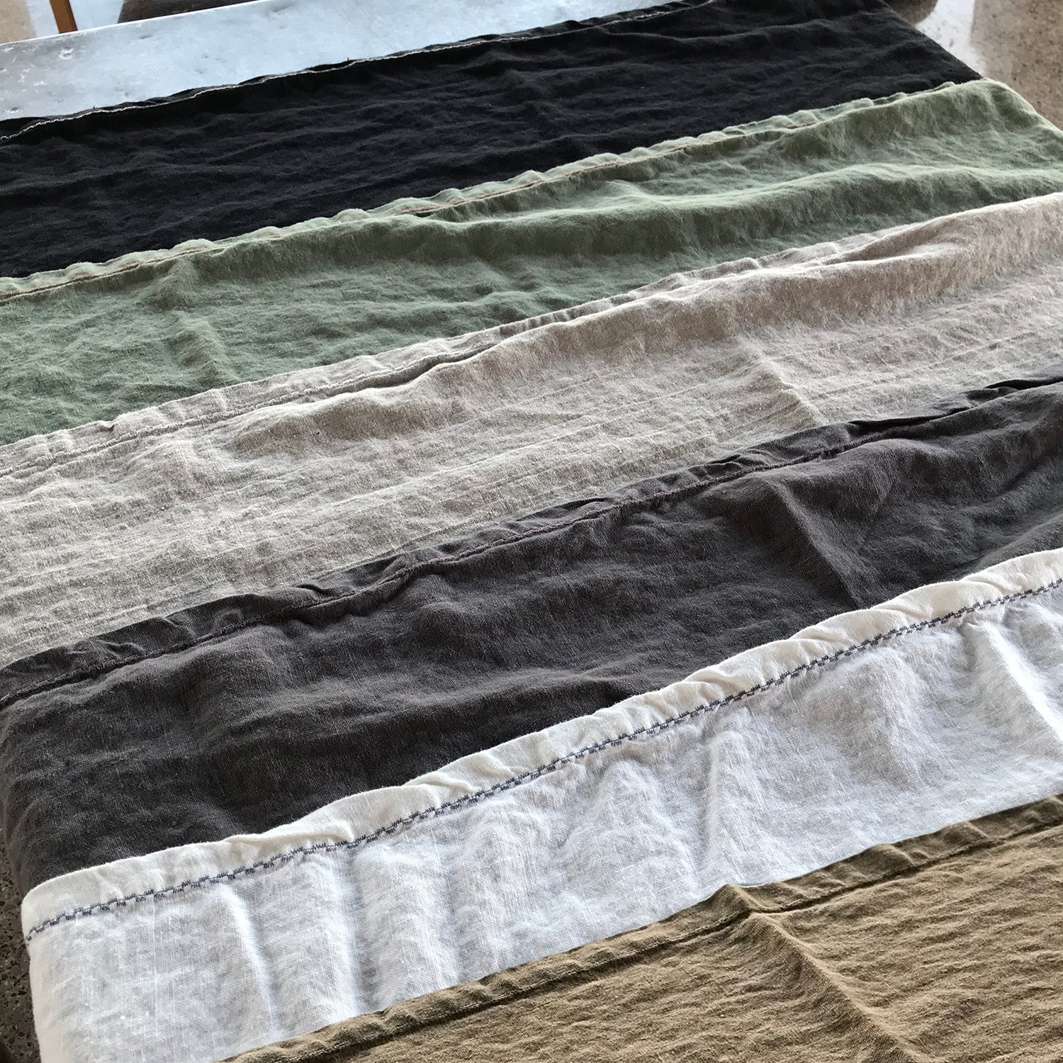 Camino de mesa de 100% lino lavado de la colección Marrakech con hilo de color o normal. En varios colores y varias medidas. Nuestros super amplios caminos para sustituir el mantel. Podemos hacer medidas especiales.