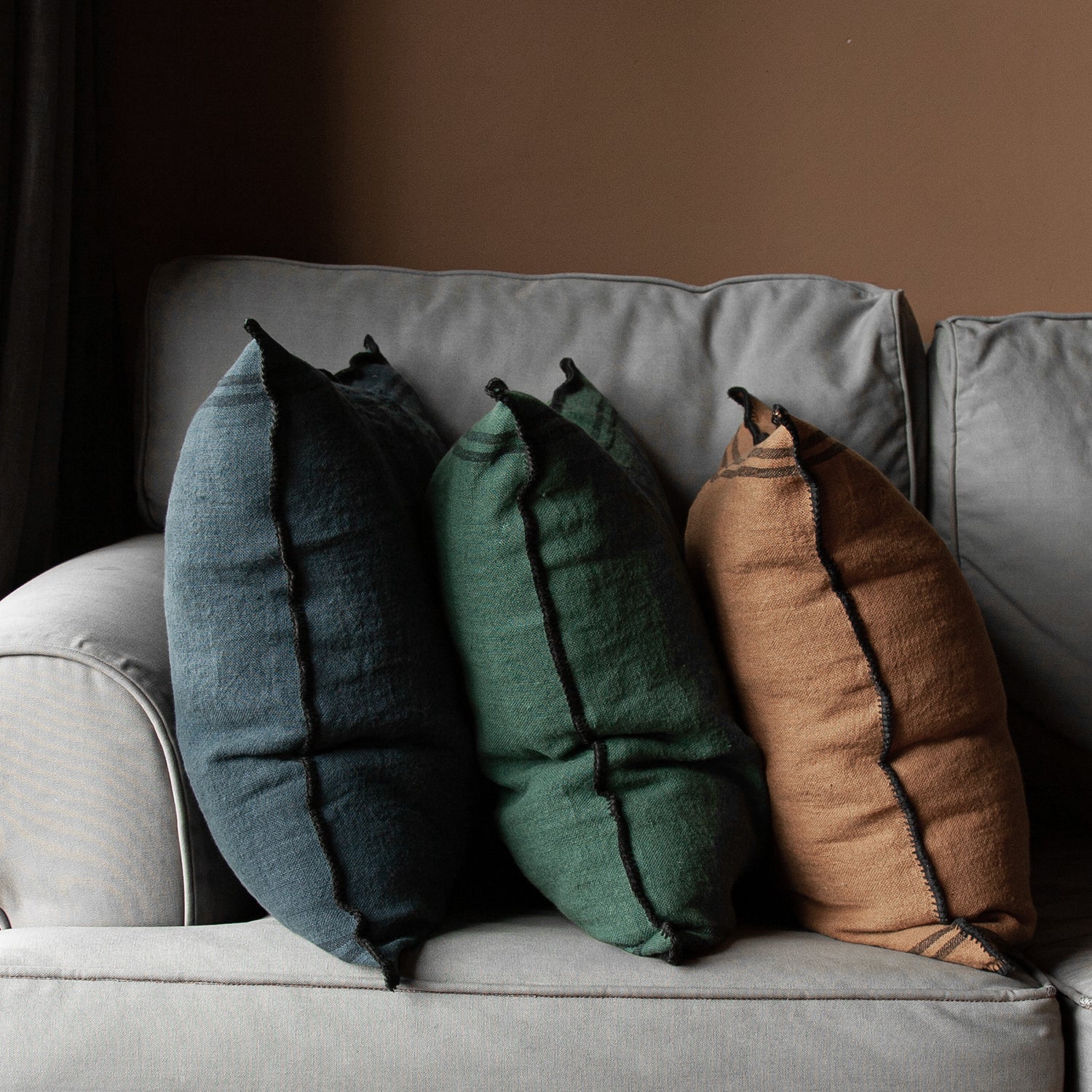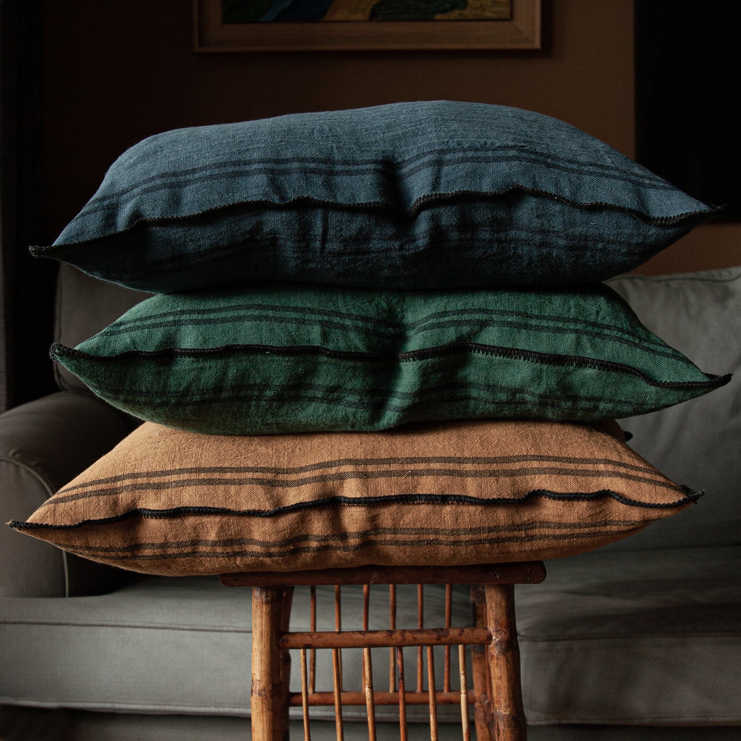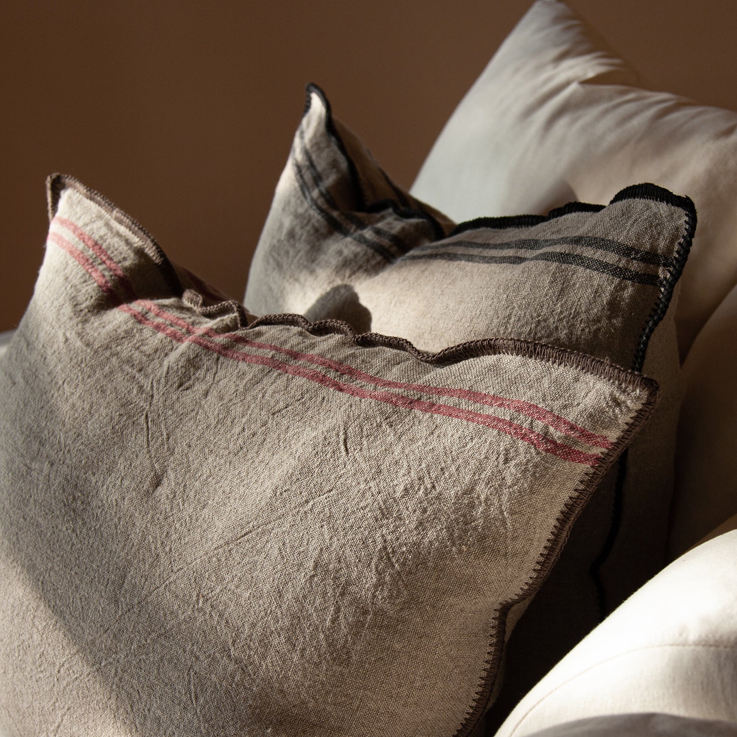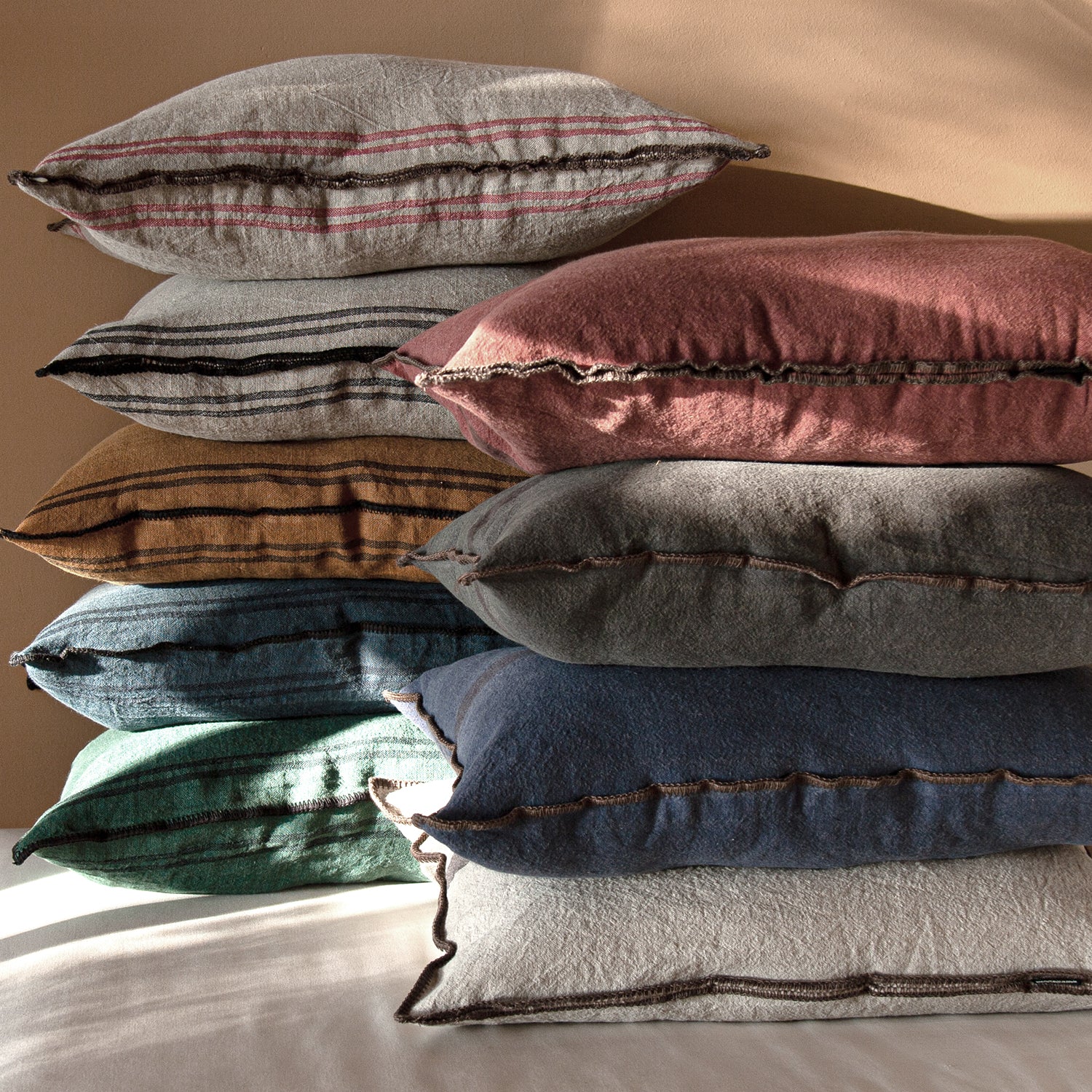 Cojín de lino rayado de 300gr/m2. Sus tres colores son muy combinables entre si. Estos cojines se venden con el relleno incluido (desenfundables) y tienen un tamaño de 50x70cm o 50x60cm. Puedes combinarlos con los cojines Terra.