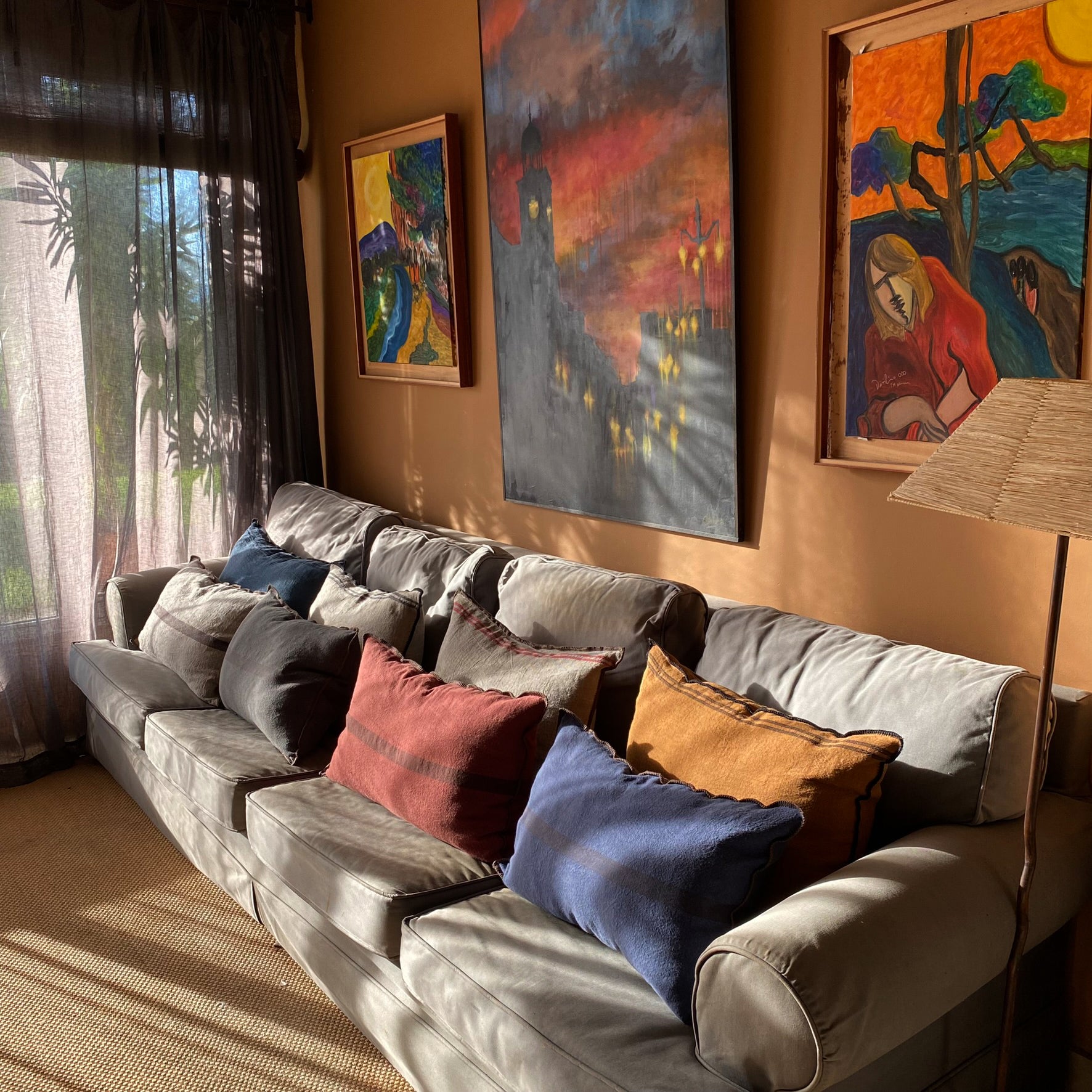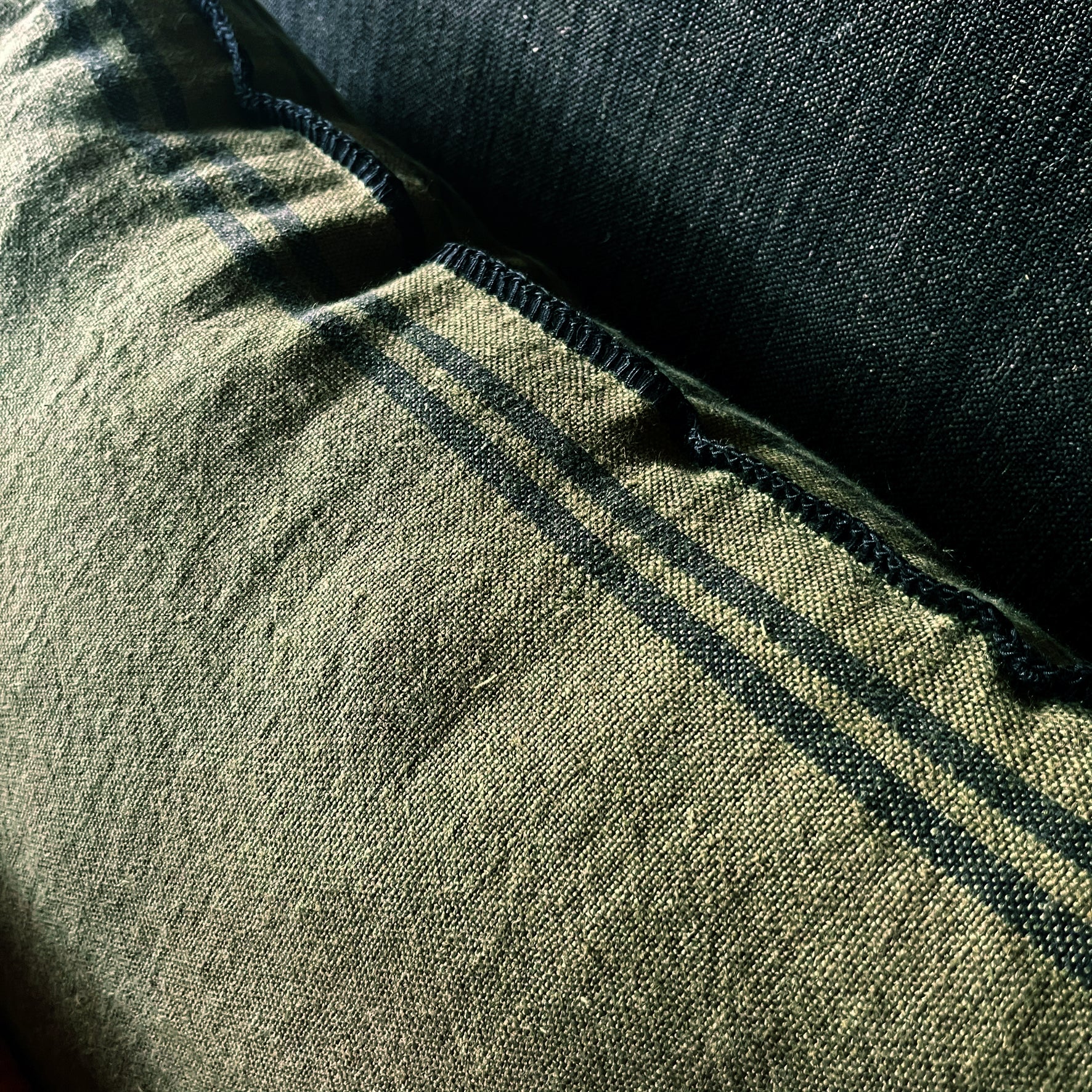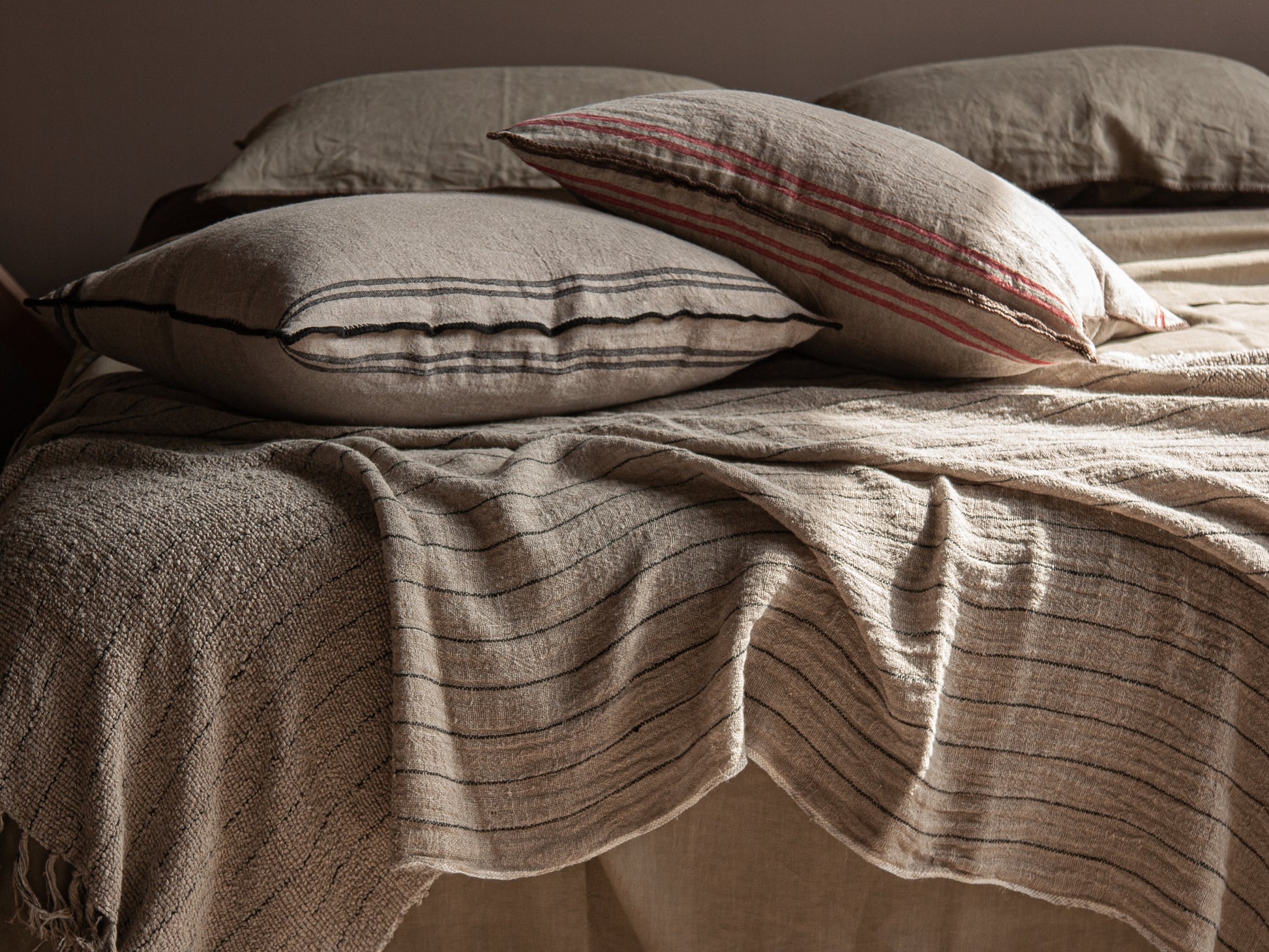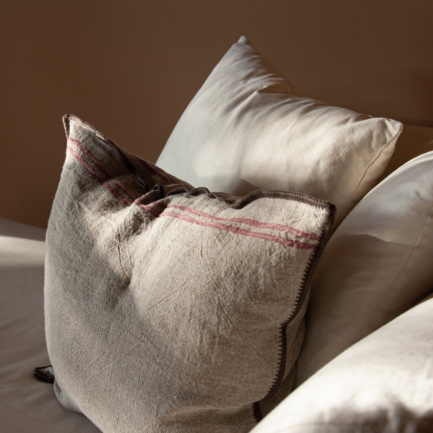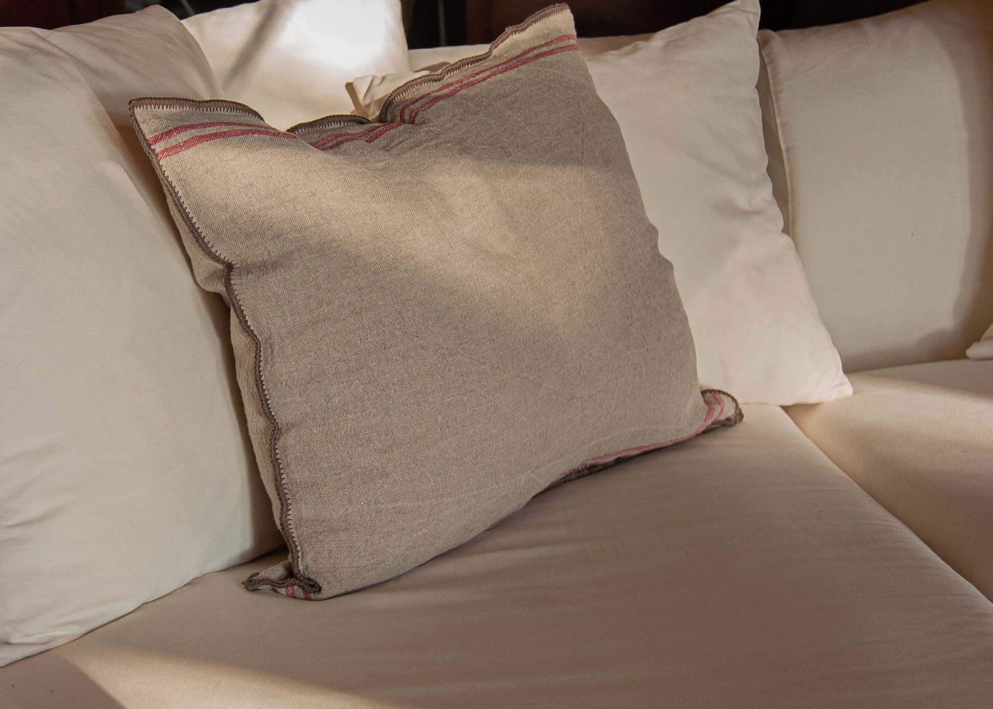 Cojín de lino rayado de 300gr/m2. Sus tres colores son muy combinables entre si. Estos cojines se venden con el relleno incluido (desenfundables) y tienen un tamaño de 50x70cm o 50x60cm. Puedes combinarlos con los cojines Terra.