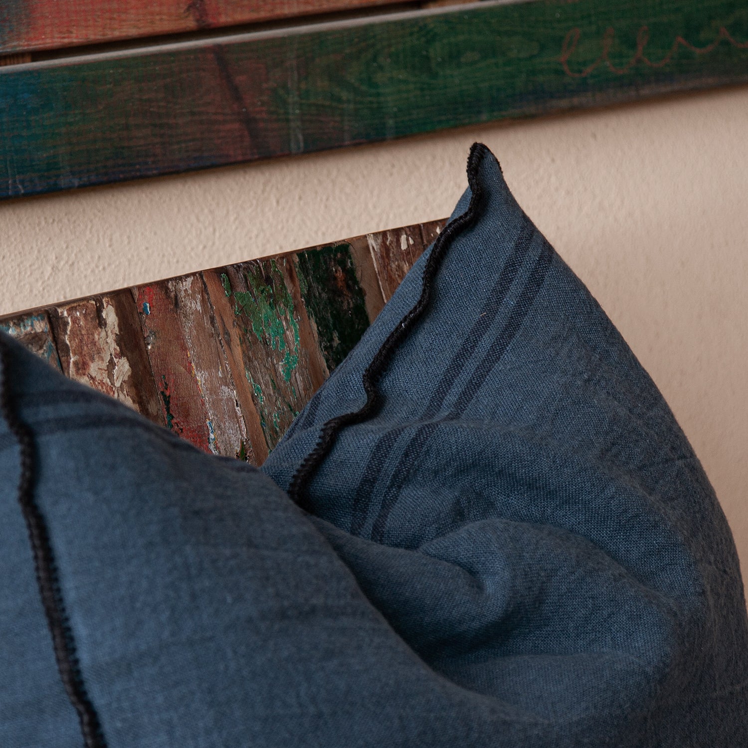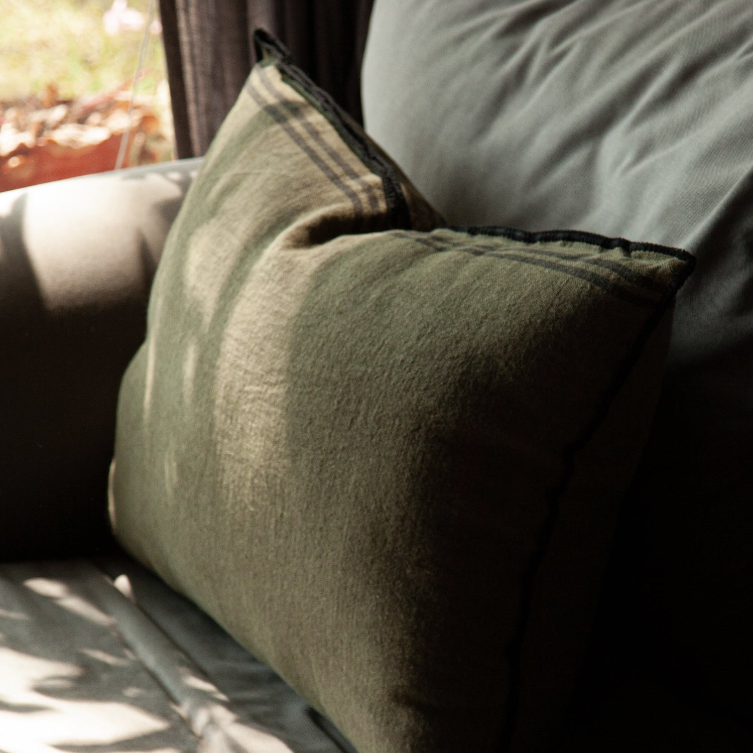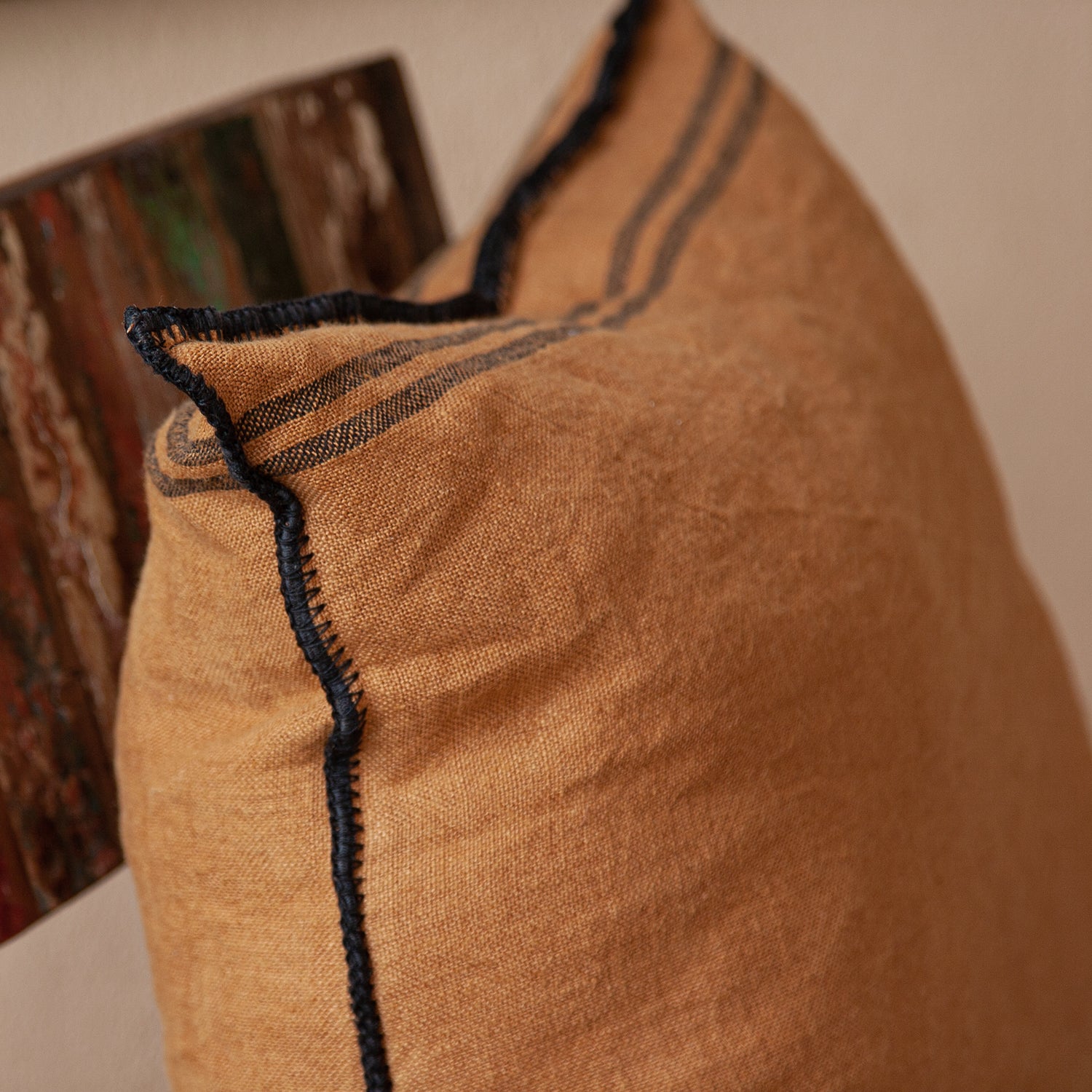 Cojín de lino con acabado bordado negro de puntada ancha.