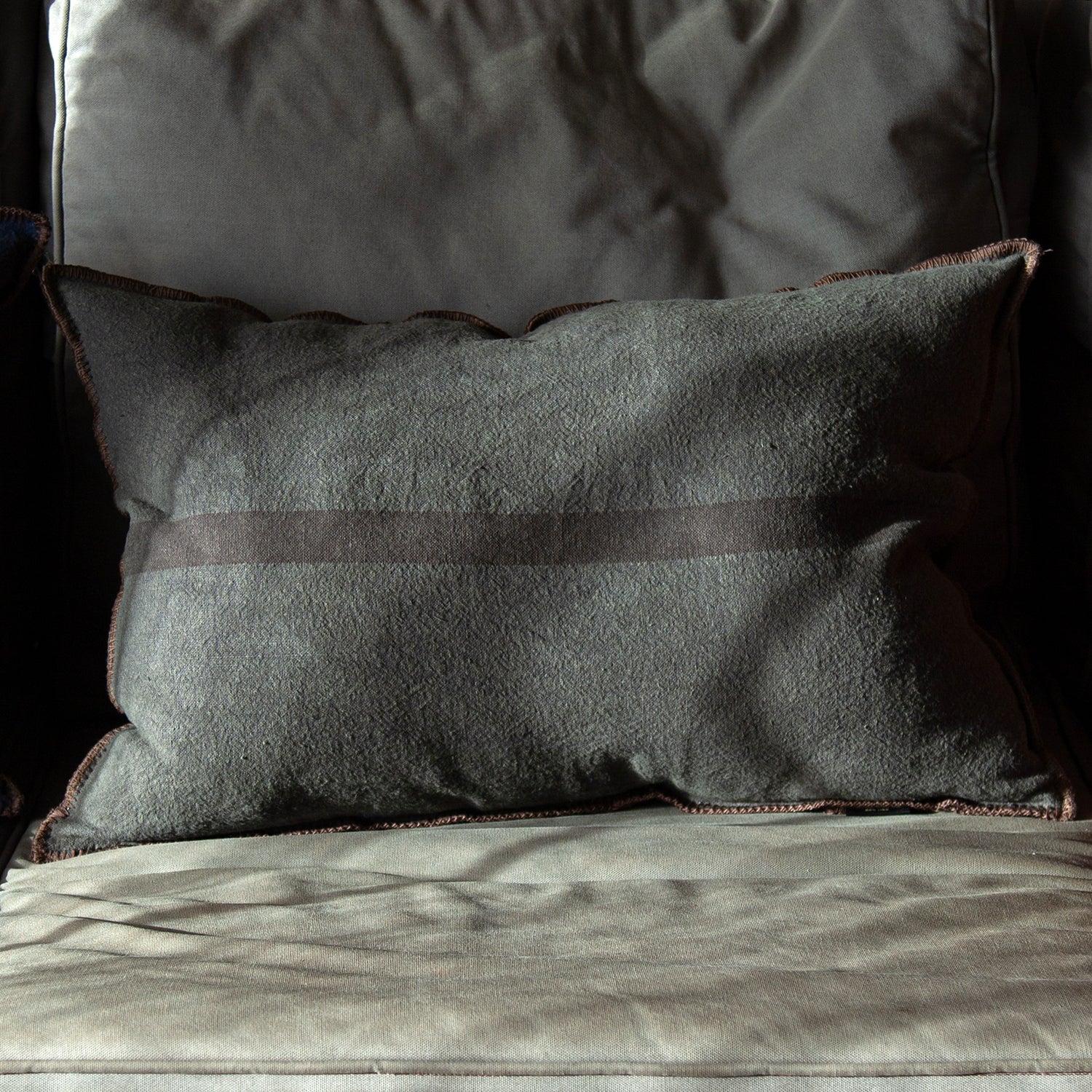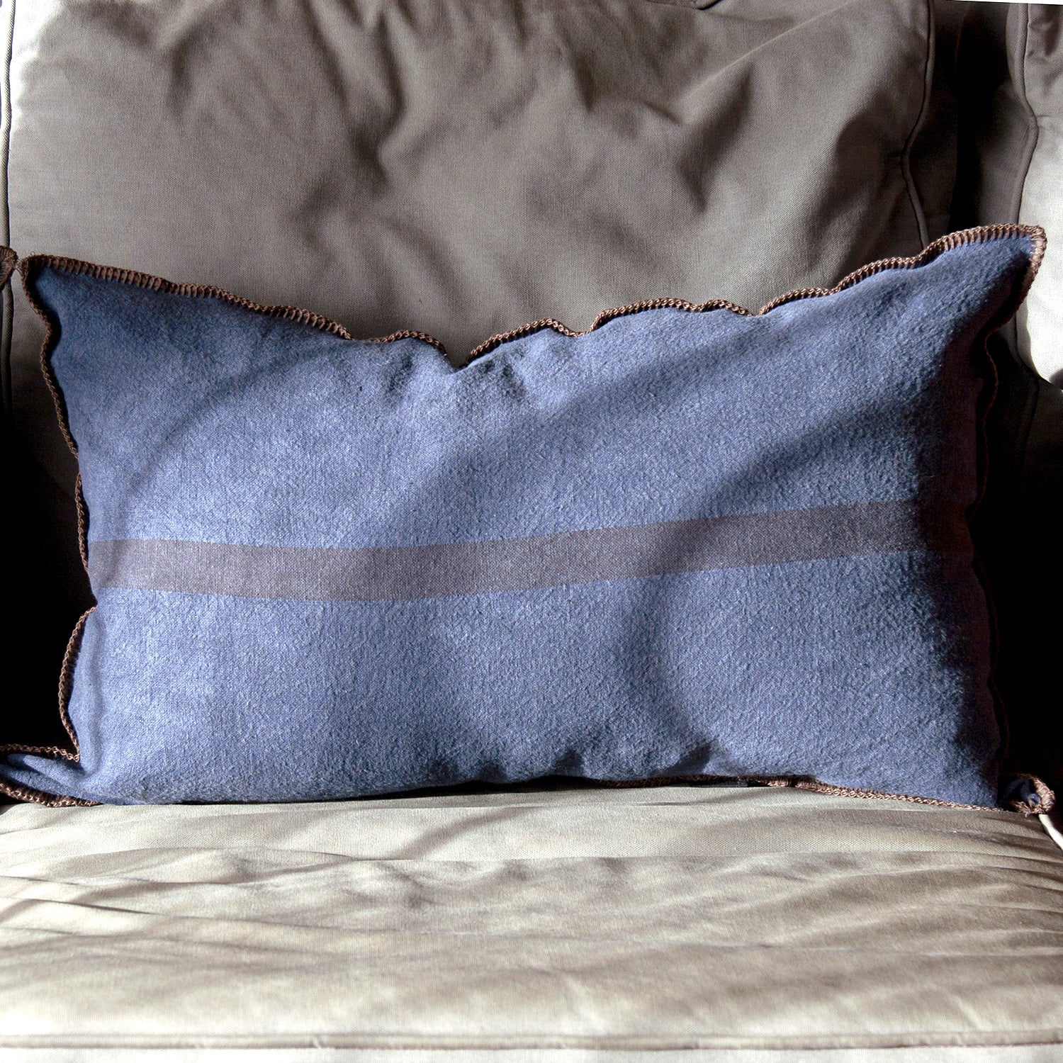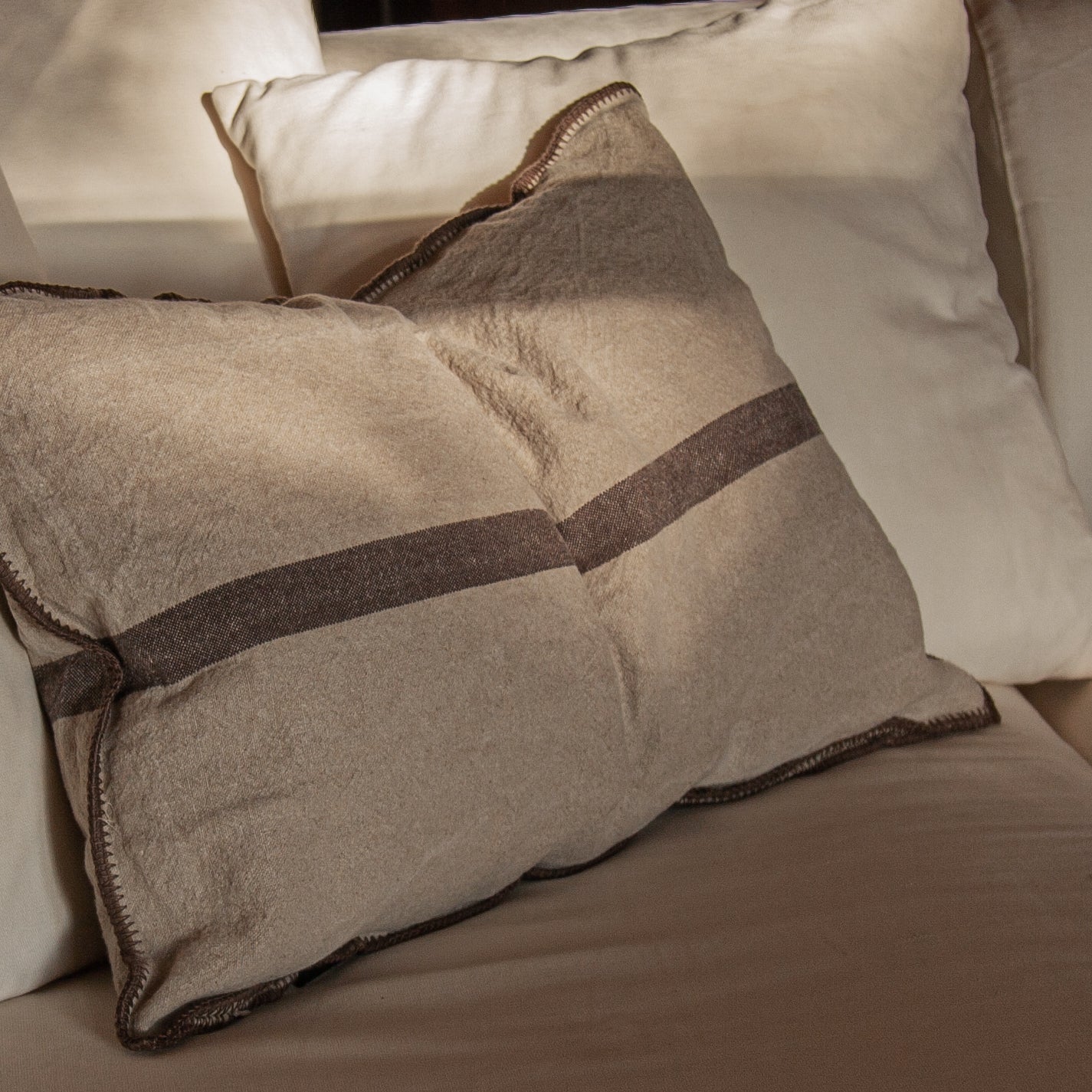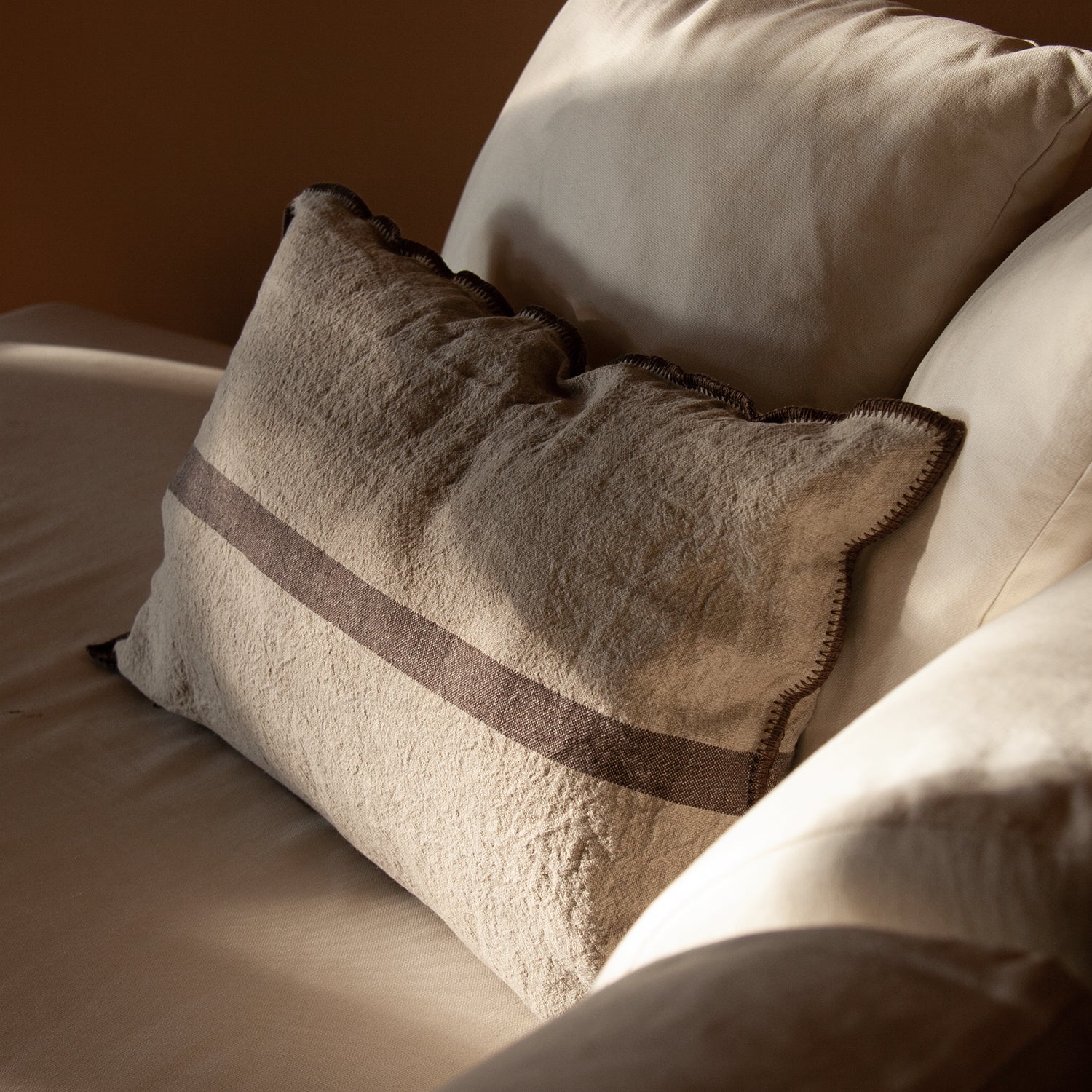 Cojín de lino con acabado bordado marrón de puntada ancha.