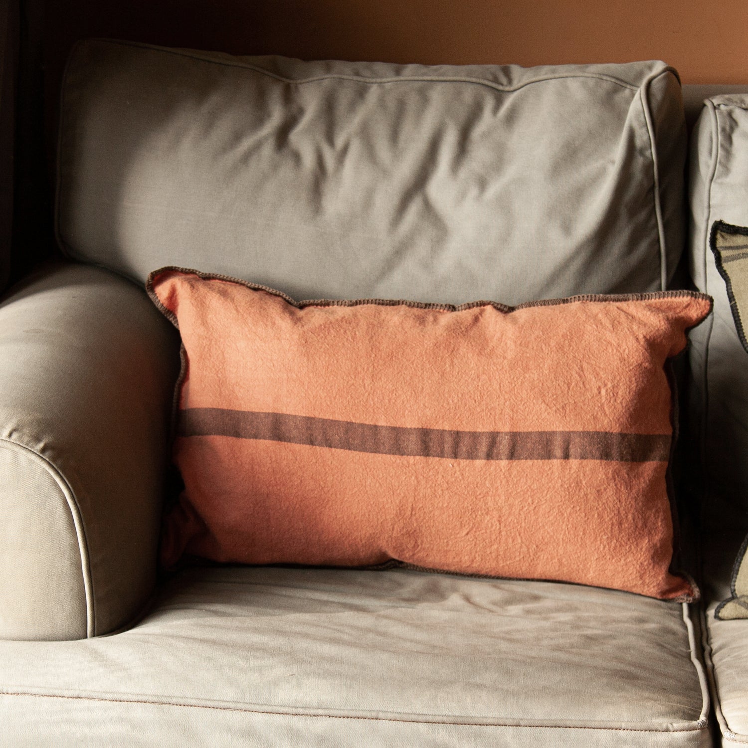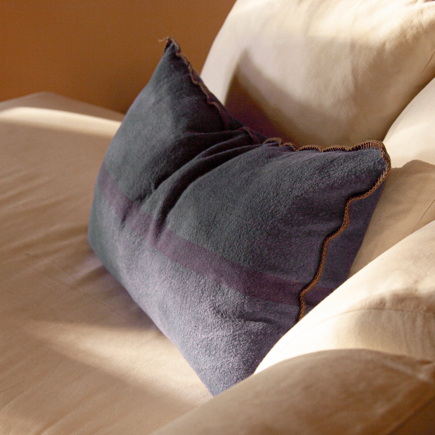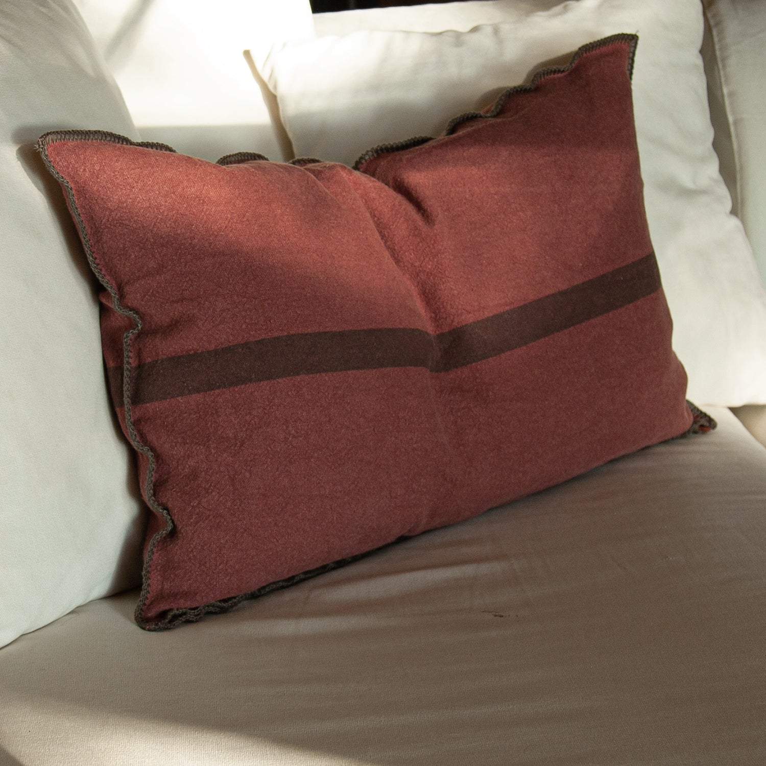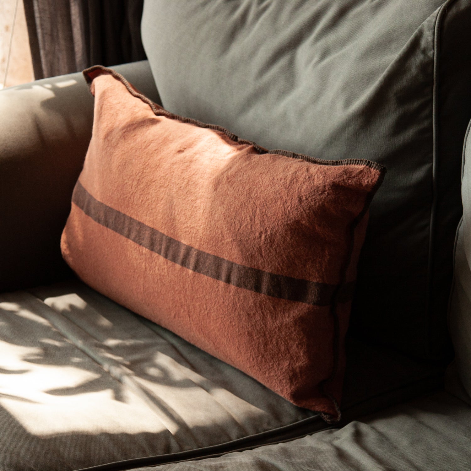 Cojín de lino con acabado bordado marrón de puntada ancha.