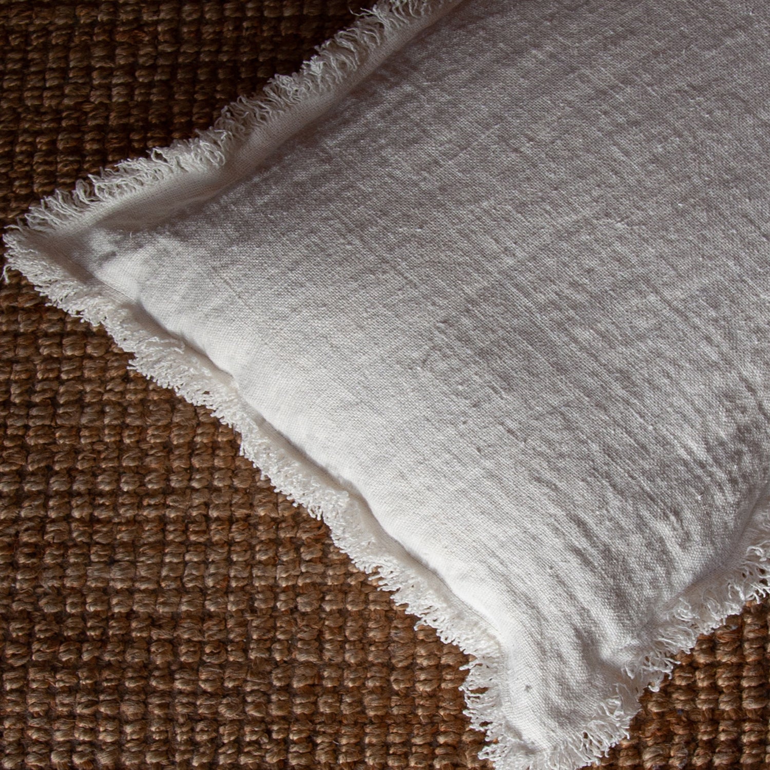 Crea un ambiente unicolor combinando muchos cojines iguales con los dos acabados combinables; desflecados y con envelope.