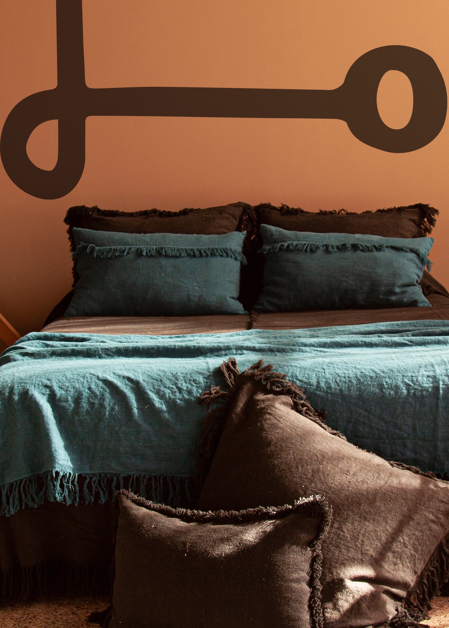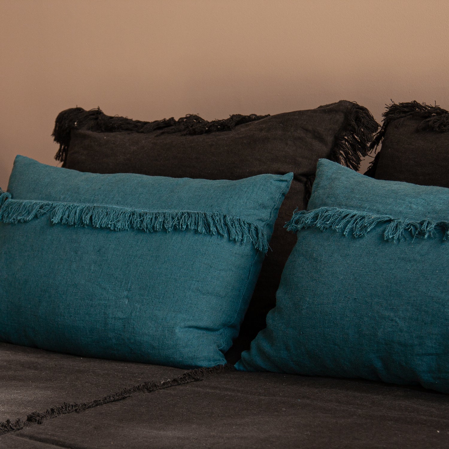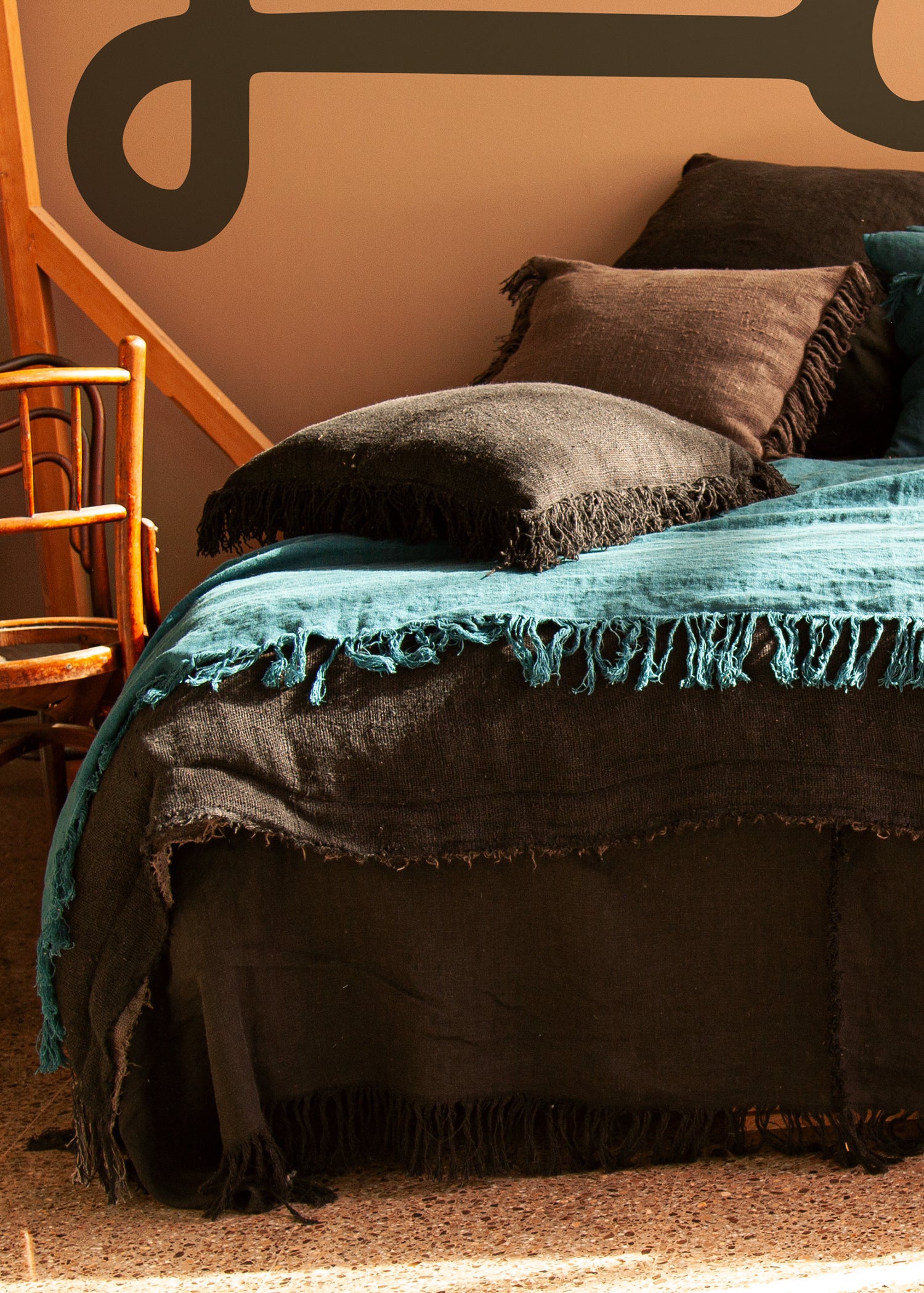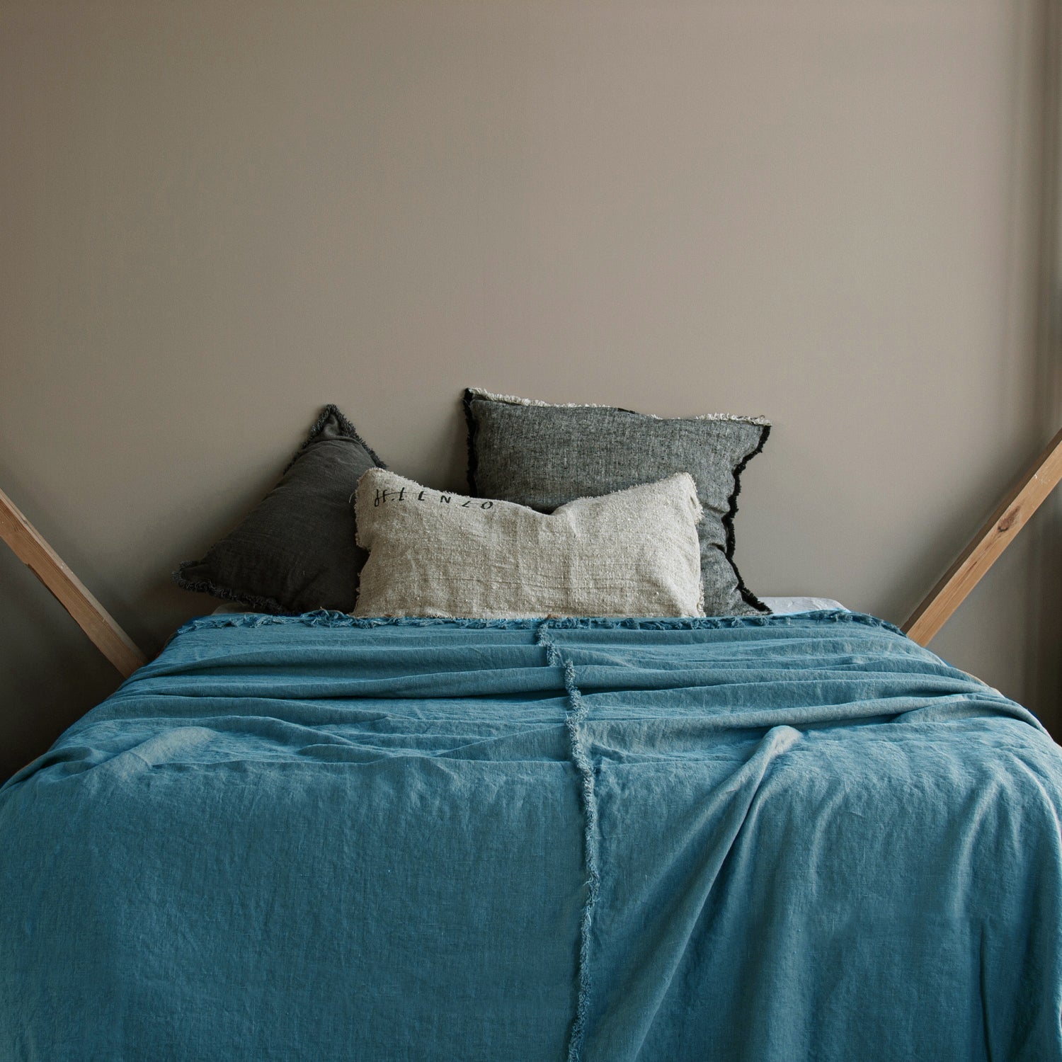 Colcha de 100% lino Azul, desflecadas de forma artesanal. Doblándola por su centro podrás utilizarla como Plaid. Pídenos las muestras de color gratuitas