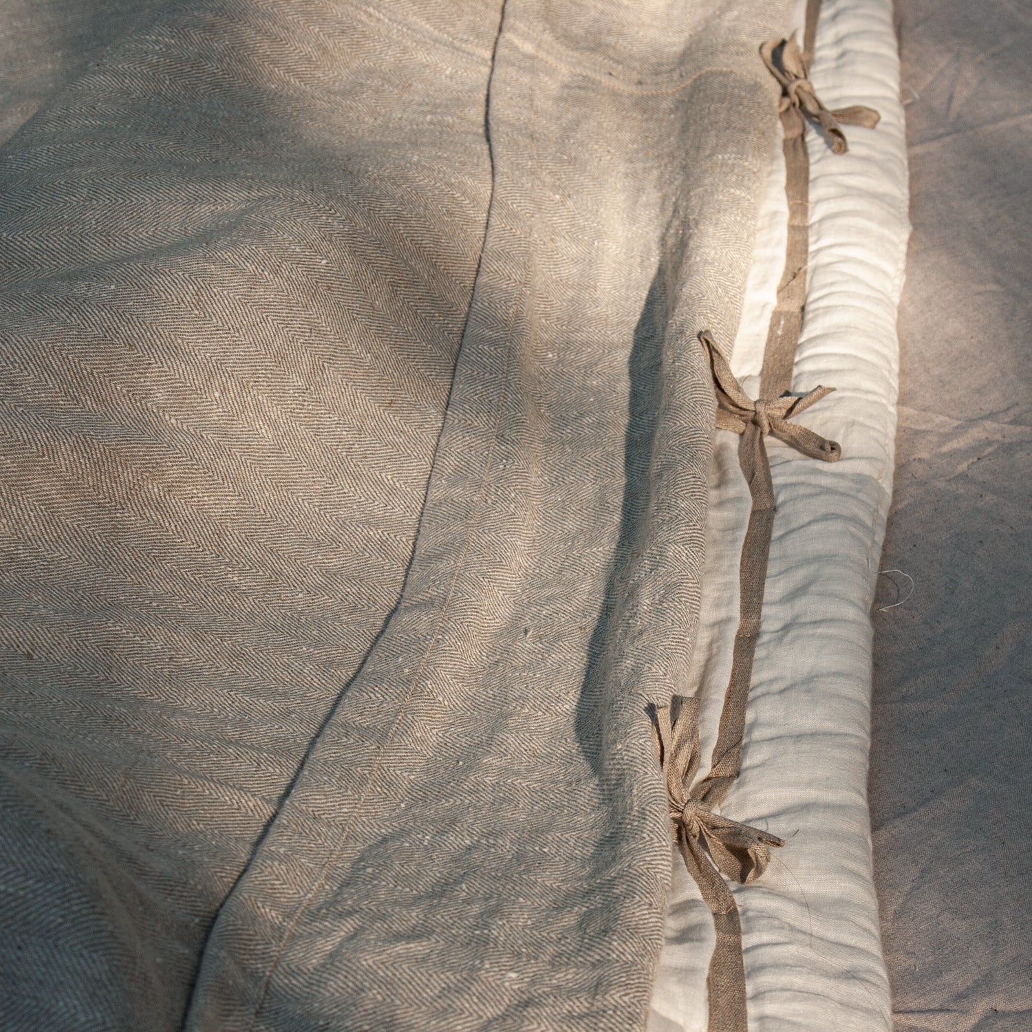 Confeccionados artesanalmente con nuestro lino tejido espigado en dos tonos naturales de 100% lino; suave, apto para lavadora y secadora. Este tono combina muy bien con todos los colores de la colección de ropa de cama. Puedes ponerle el relleno de lana para el invierno.