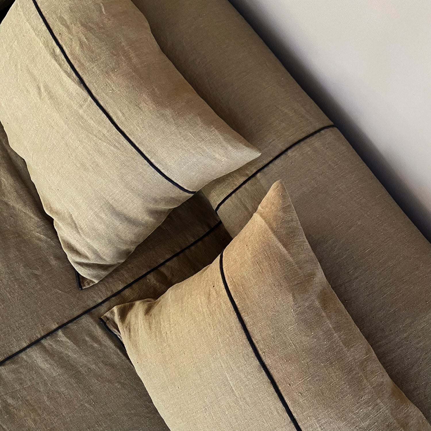 Plaid y Colcha de lino de color Arena ( tono vainilla), blanco, gris (medio), terracota (color arcilla), verde (entre hoja y olivo), negra y natural ( mas gris que el Arena) con un vivo de color a elegir.