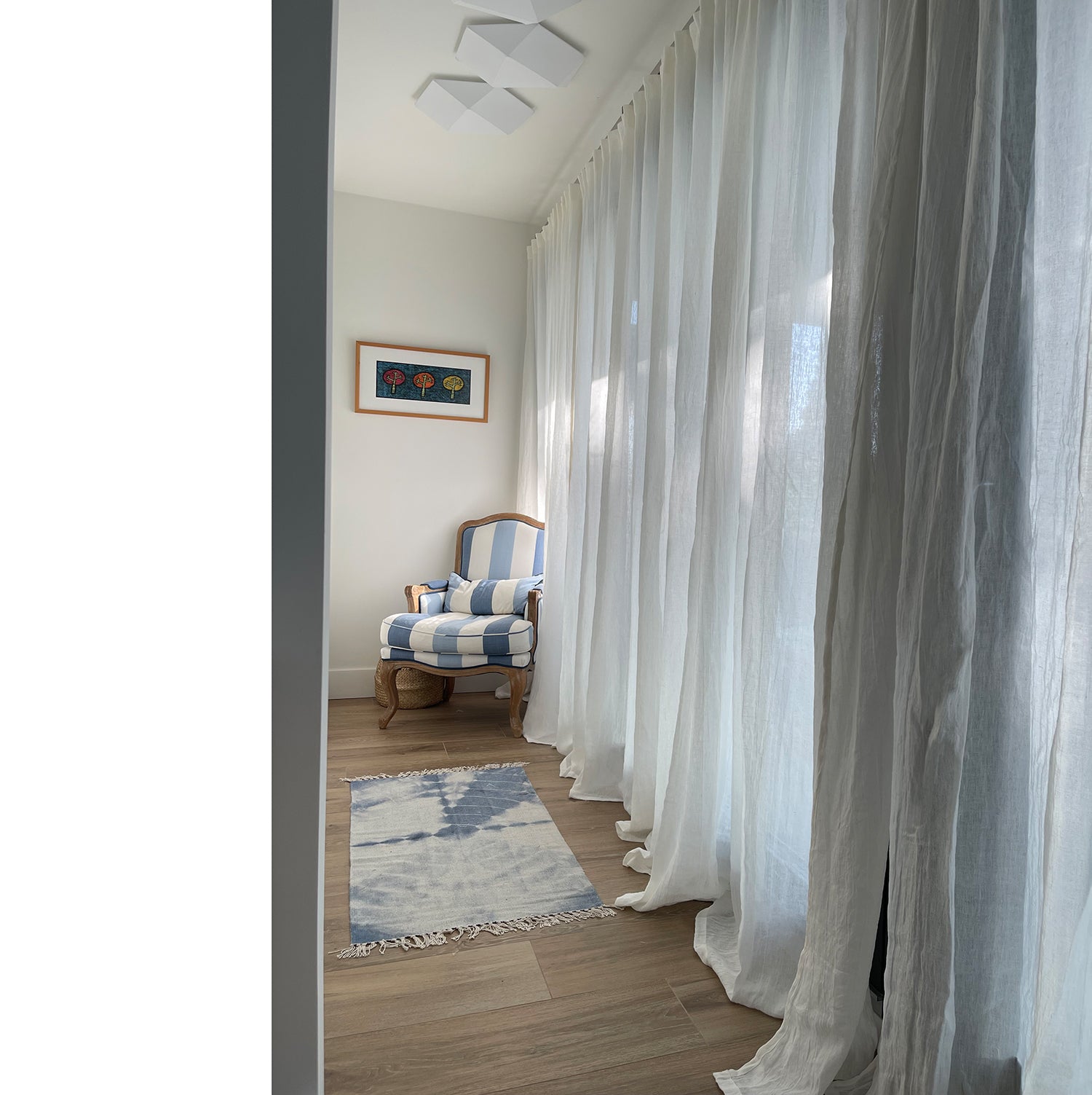 Cortina blanco roto. Con una caída pesada sin perder la ligereza del lino. Tienen el gramaje suficiente para no ver ni que te vean desde el exterior. Son ideales para habitaciones de dormir.