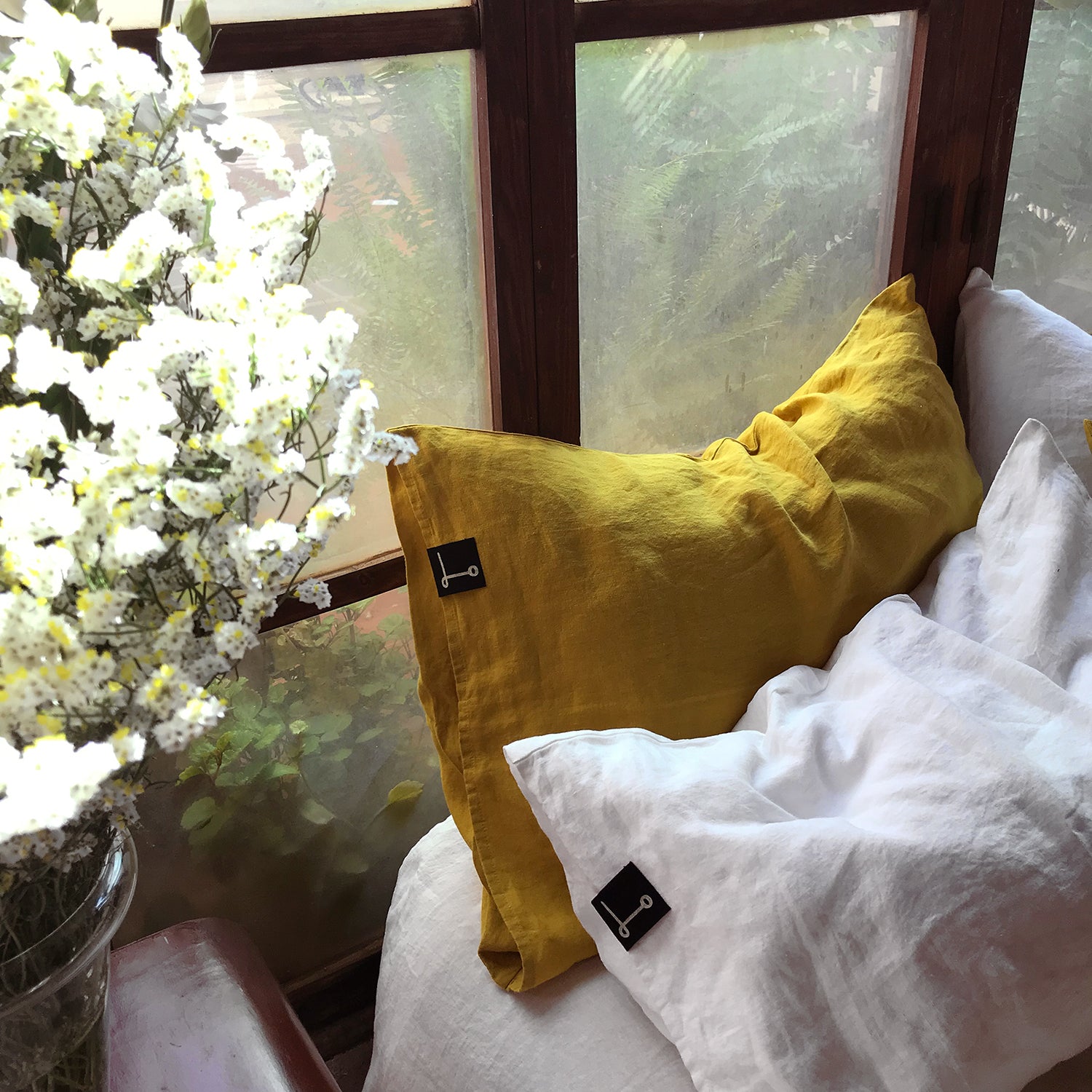 Funda de lino lavado de color mostaza rojizo de 190 g/m2 con cierre de solapa. Una tonalidad muy atrevida para habitaciones con poca luz. Ideal para combinar con blanco. Añádele repulgo de color.