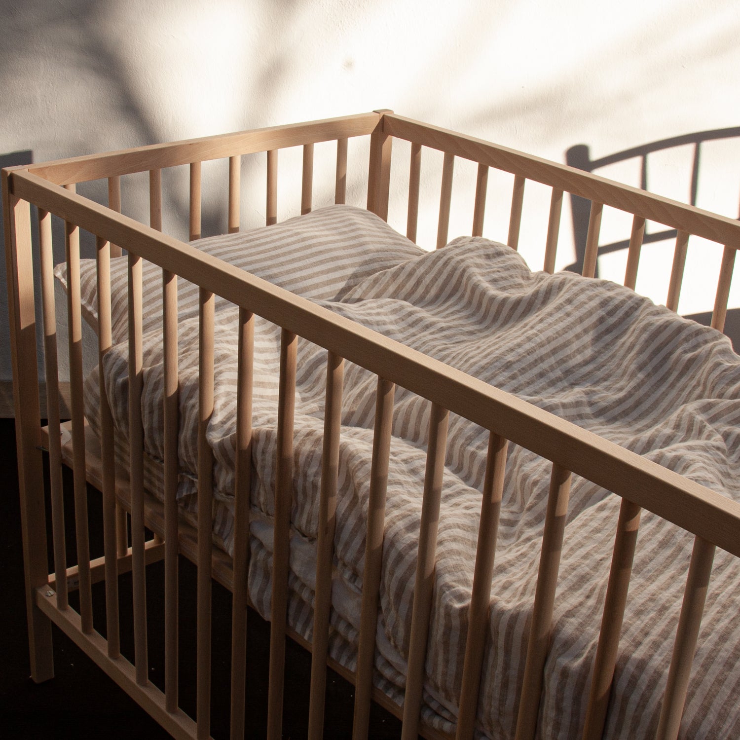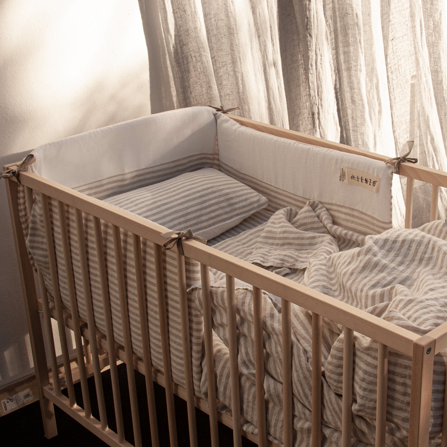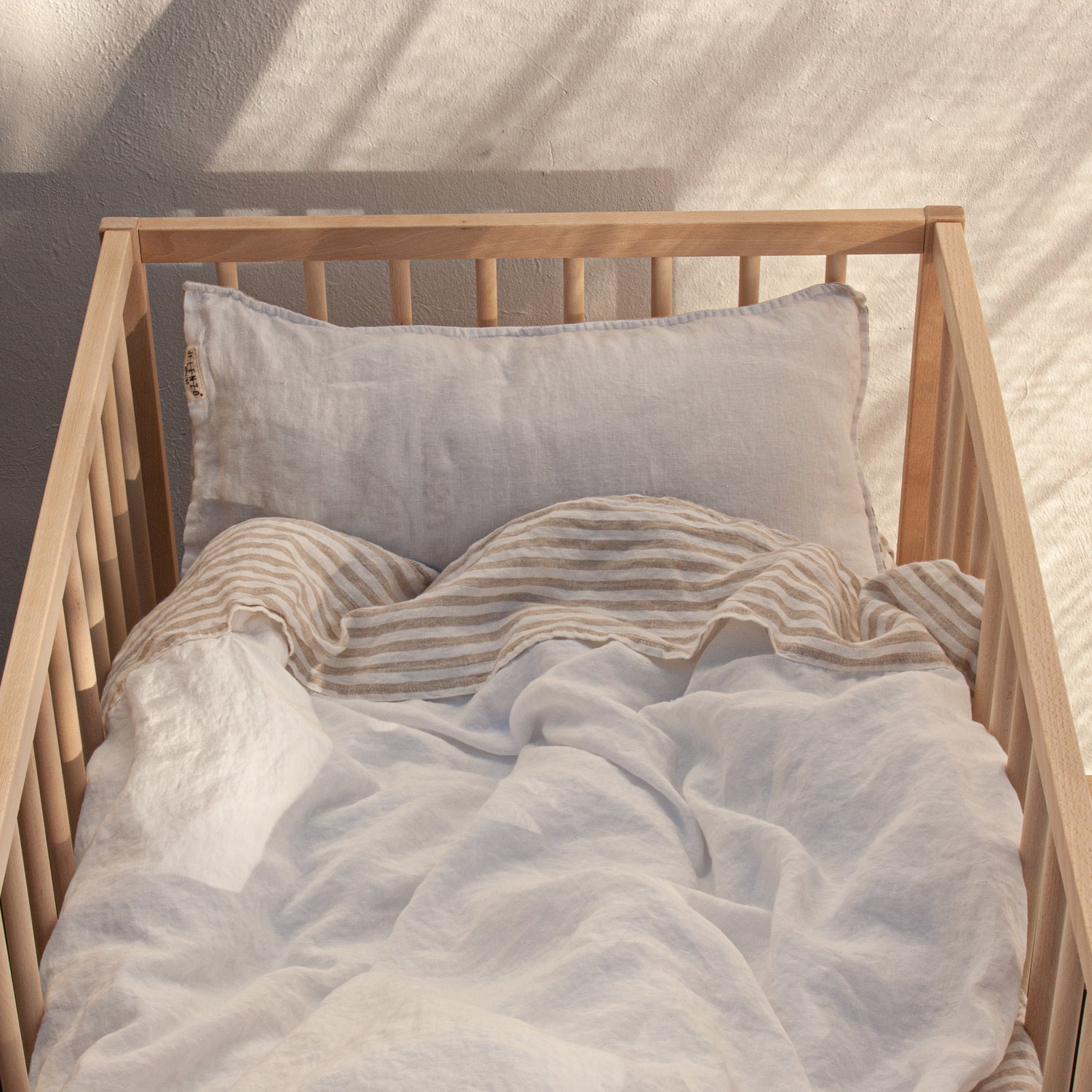Nuestra funda nórdica Colette es bicolor para que puedas ponerla por el lado que más te guste. Por un lado blanco roto y por el otro, rayadita de lino natural. La funda nórdica lleva el relleno de fibra hueca incluido y además una funda de almohada a juego.