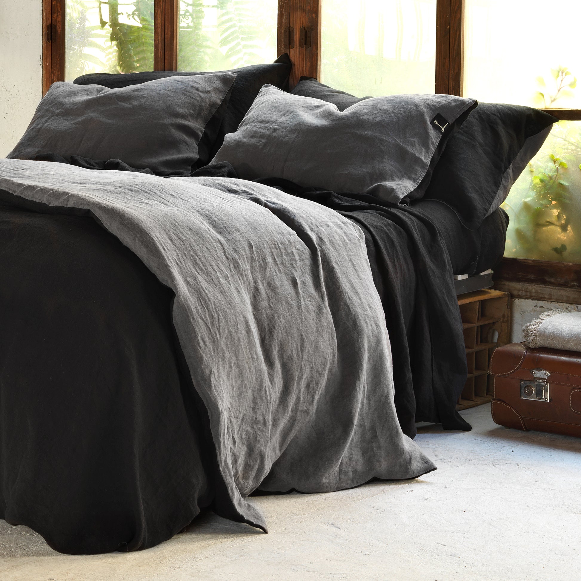 Funda nórdica reversible 100% lino lavado. Este es una de los productos más exclusivos que tenemos. Dos linos de diferentes colores juntos en una única pieza. Es como si tuvieses dos fundas nórdicas diferentes que puedes ir cambiando según te apetezca. Puedes poner bajera natural o negra. En las imágenes también verás el ejemplo de negra y gris.