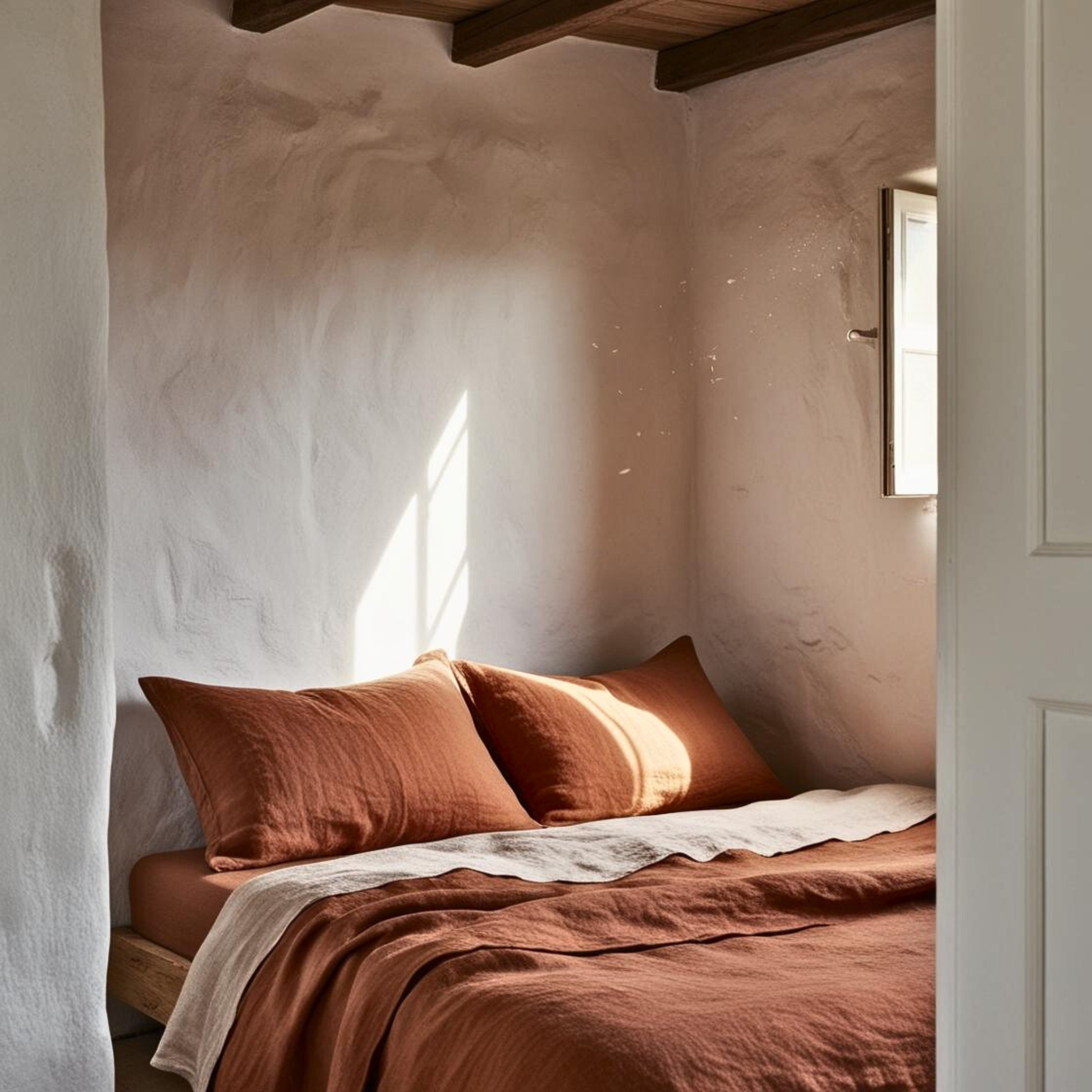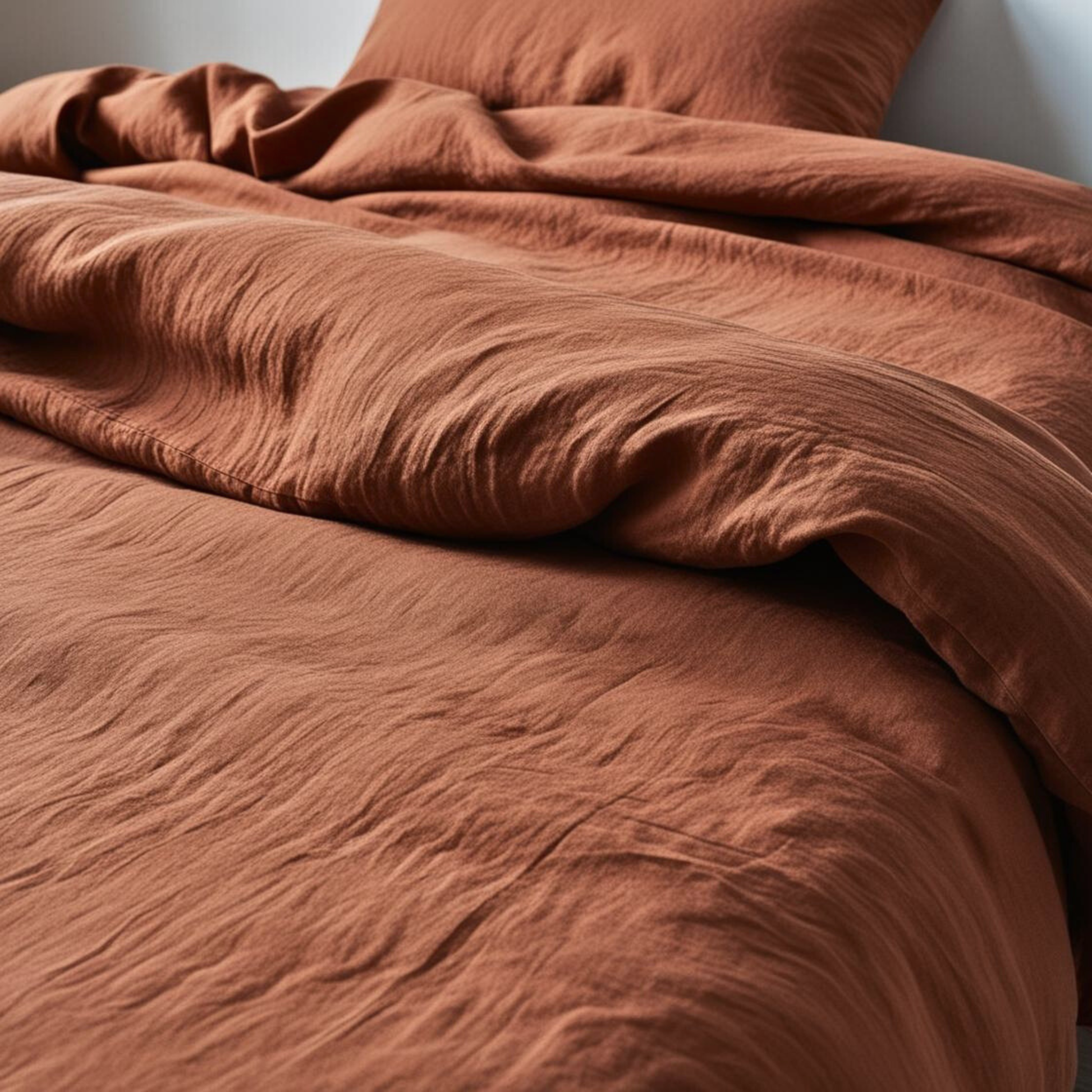 Funda nórdica 100% lino lavado de color terracota. Es un color muy combinable para habitaciones juveniles, paredes blancas, casas de campo... Tenemos dos linos teja; uno mas oscuro que el otro; pídenos las muestras.