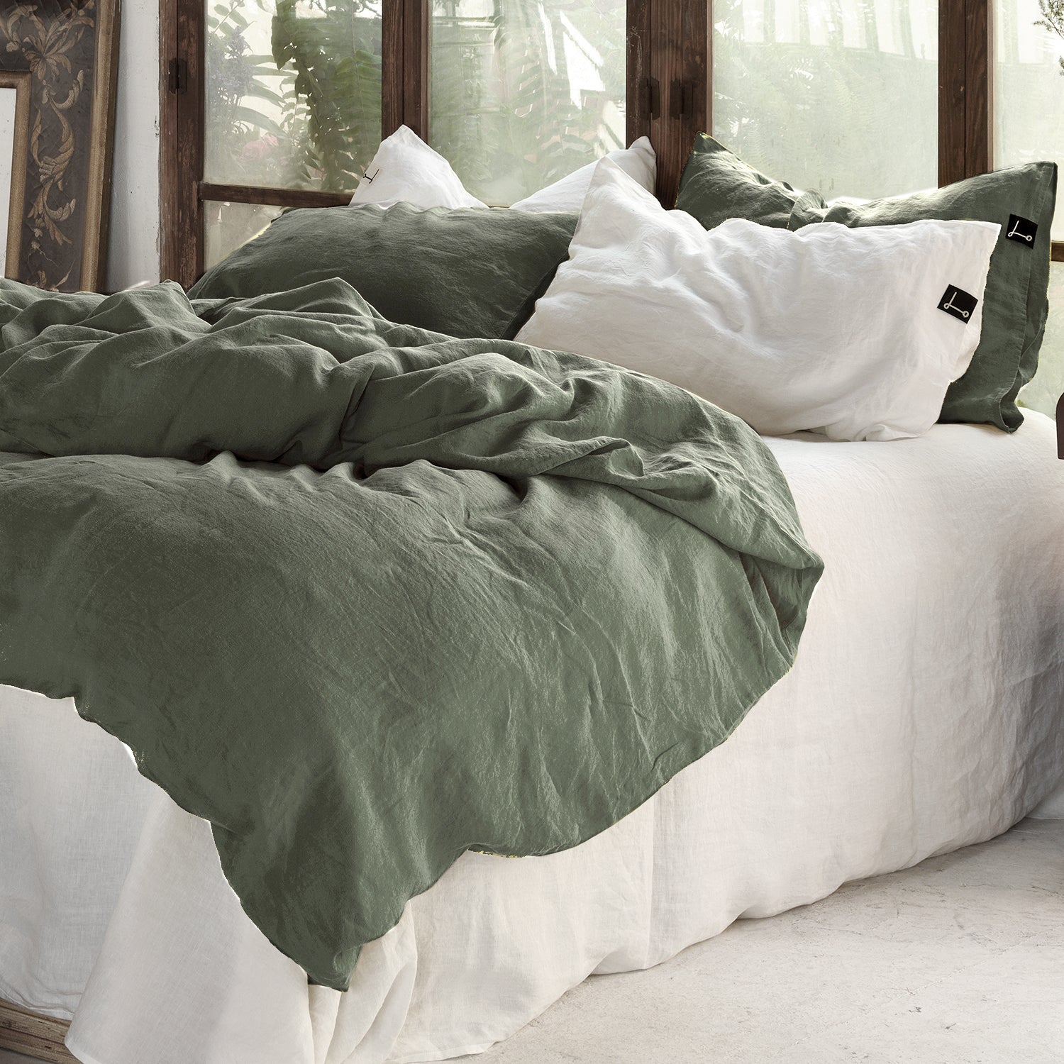 Funda nórdica de lino verde. Un verde hoja, verde caza...verde oscuro para habitaciones con mucho color. Muy combinable con el lino natural, con el negro y con los mostaza y terracotas. Puedes acabar la funda con un detalle de hilo de color VER REPULGOS.