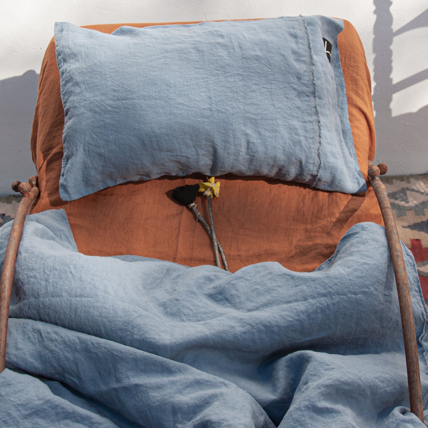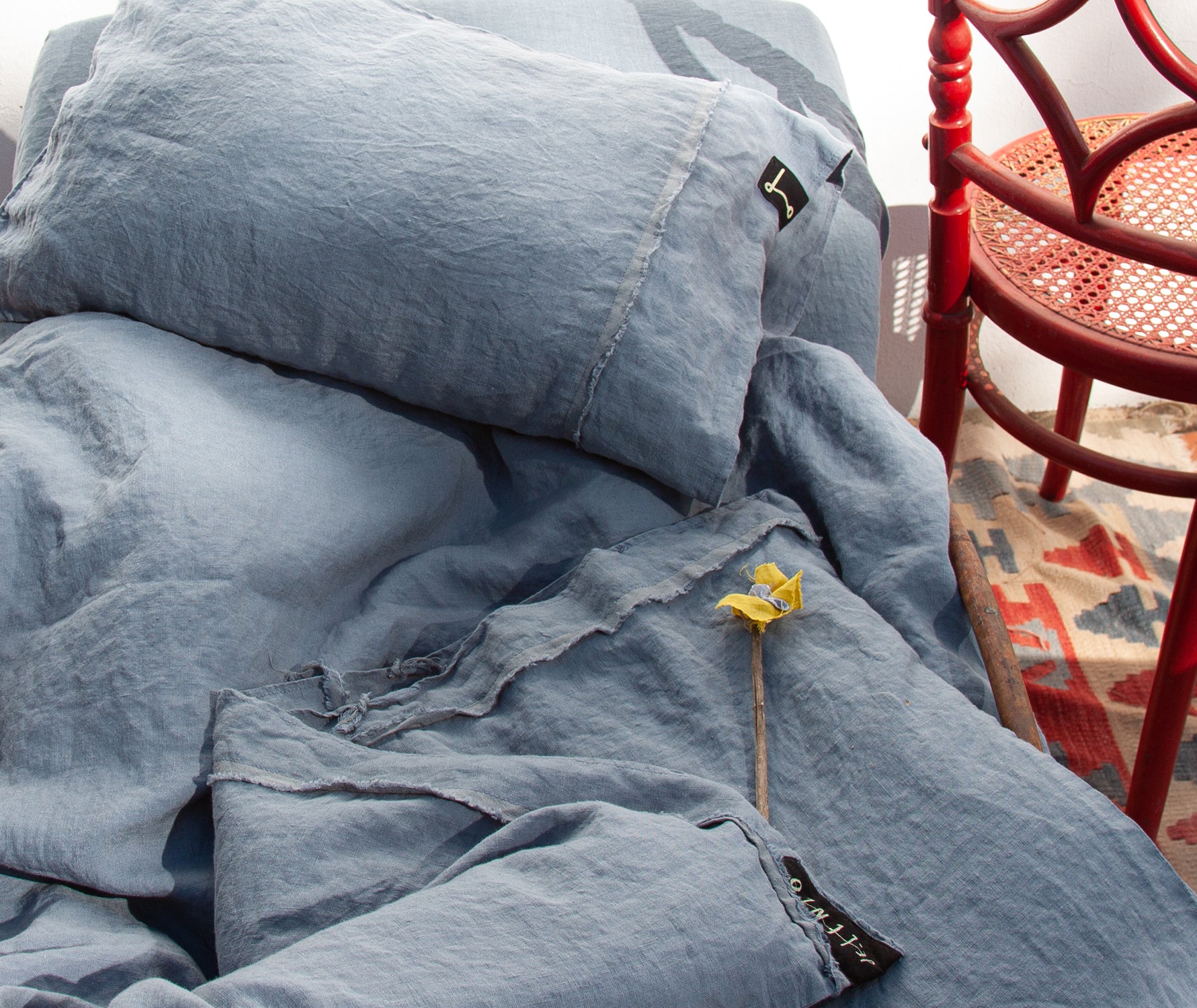 Este es un azul grisaceo, celeste, azul jean desgastado, ideal! Acabada con flequitos, le da un toque personal a tu funda nórdica. Puedes ponerle una bajera a juego o elegir una bajera teja del mismo tipo de lino. El lino de un gramaje medio (180gr) es ideal para los más pequeños por su gran transpirabilidad. La funda de almohada lleva el relleno de fibra hueca incluido. En el juego completo (Funda nórdica + bajera + almohada) la bajera es azul. SI prefieres otro color, anótalo en notas