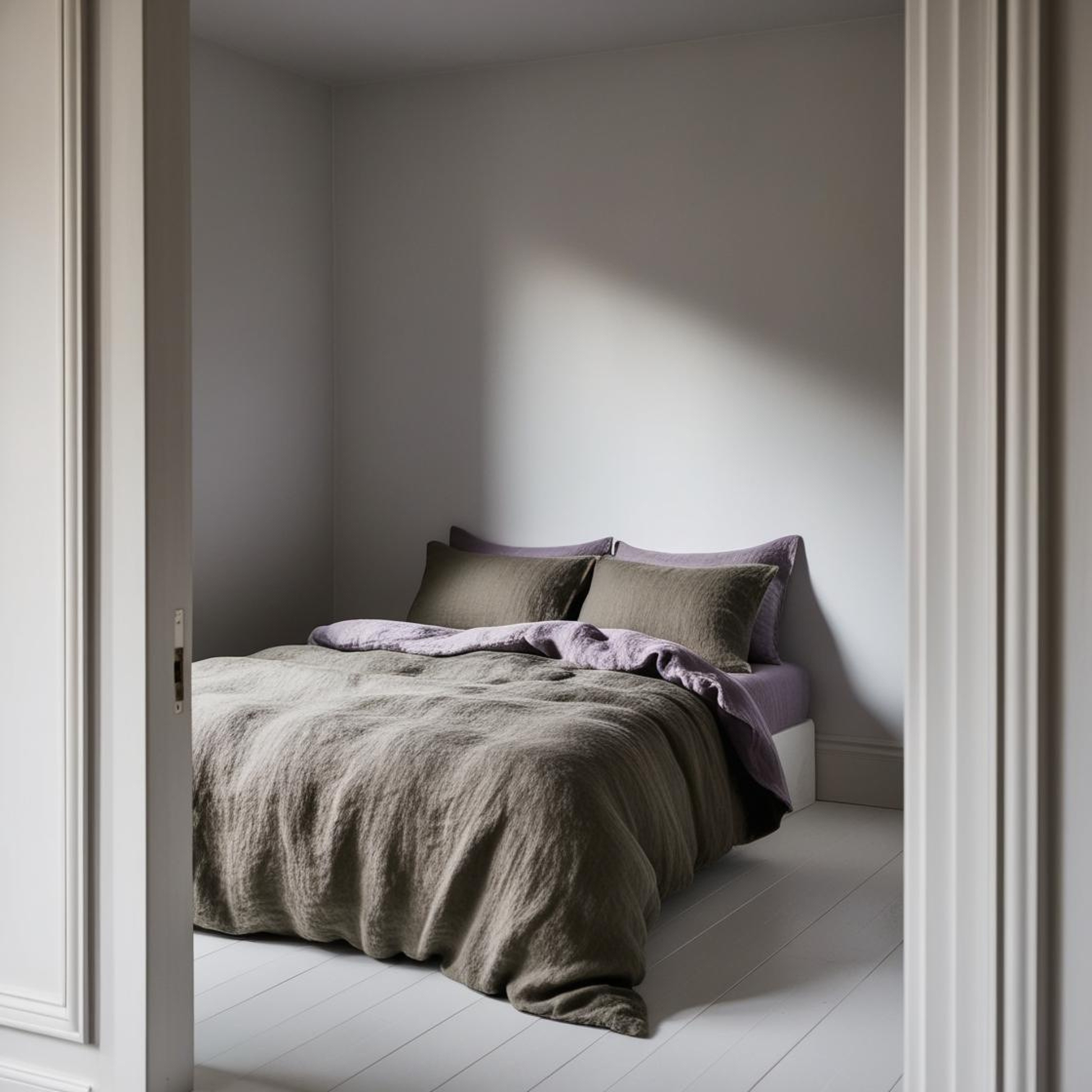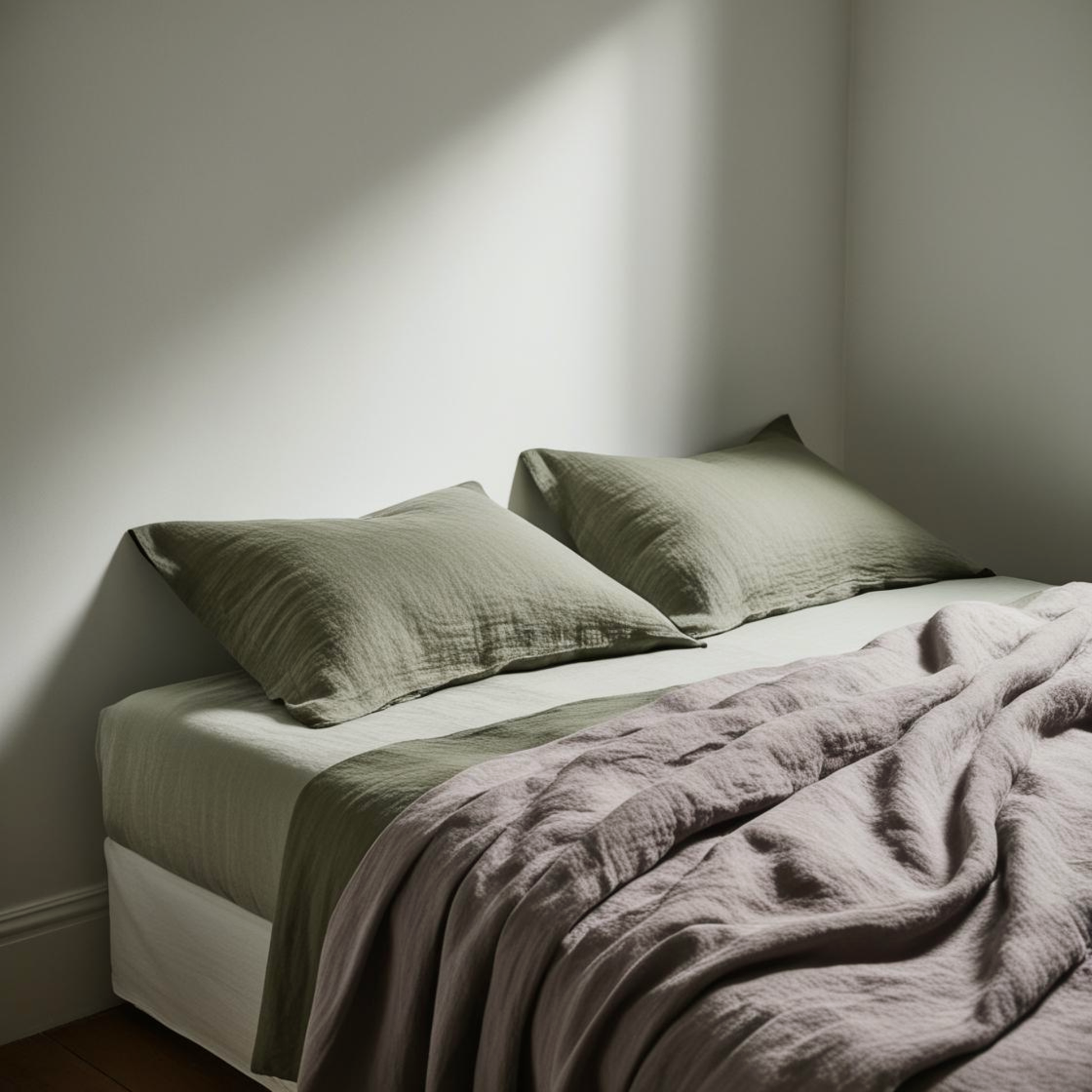 Funda nórdica, fundas de almohada y sábana bajera ajustable de lino lavado malva & verde olivo claro o verde olivo oscuro. Puedes elegir el tono de bajera que prefieras.