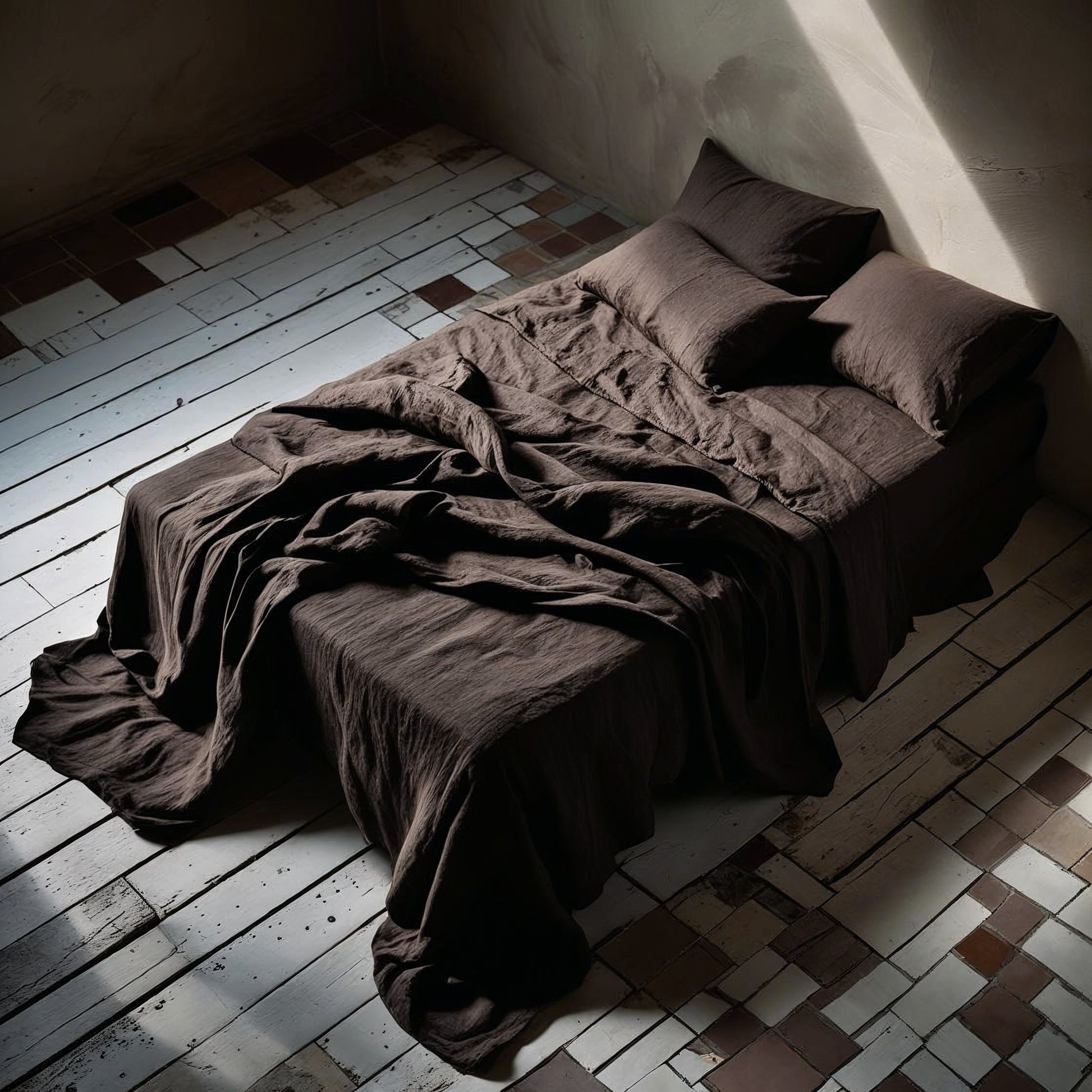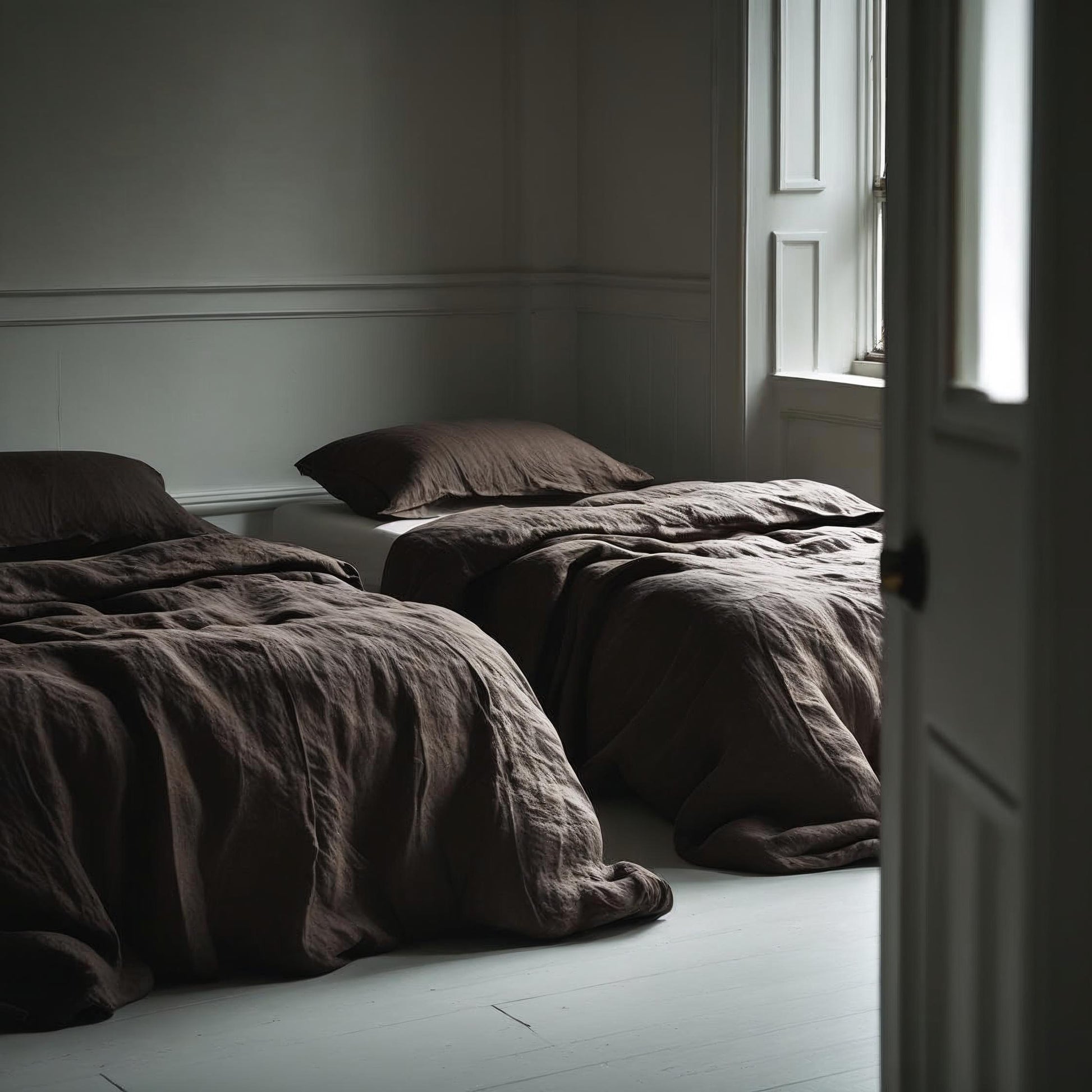 Juego de funda nórdica, fundas de almohada y sábana bajera ajustable de lino lavado. Este color marrón café, tiene una tonalidad rosácea, combina de forma extraordinaria con el malva y el berenjena. Bellísimo.