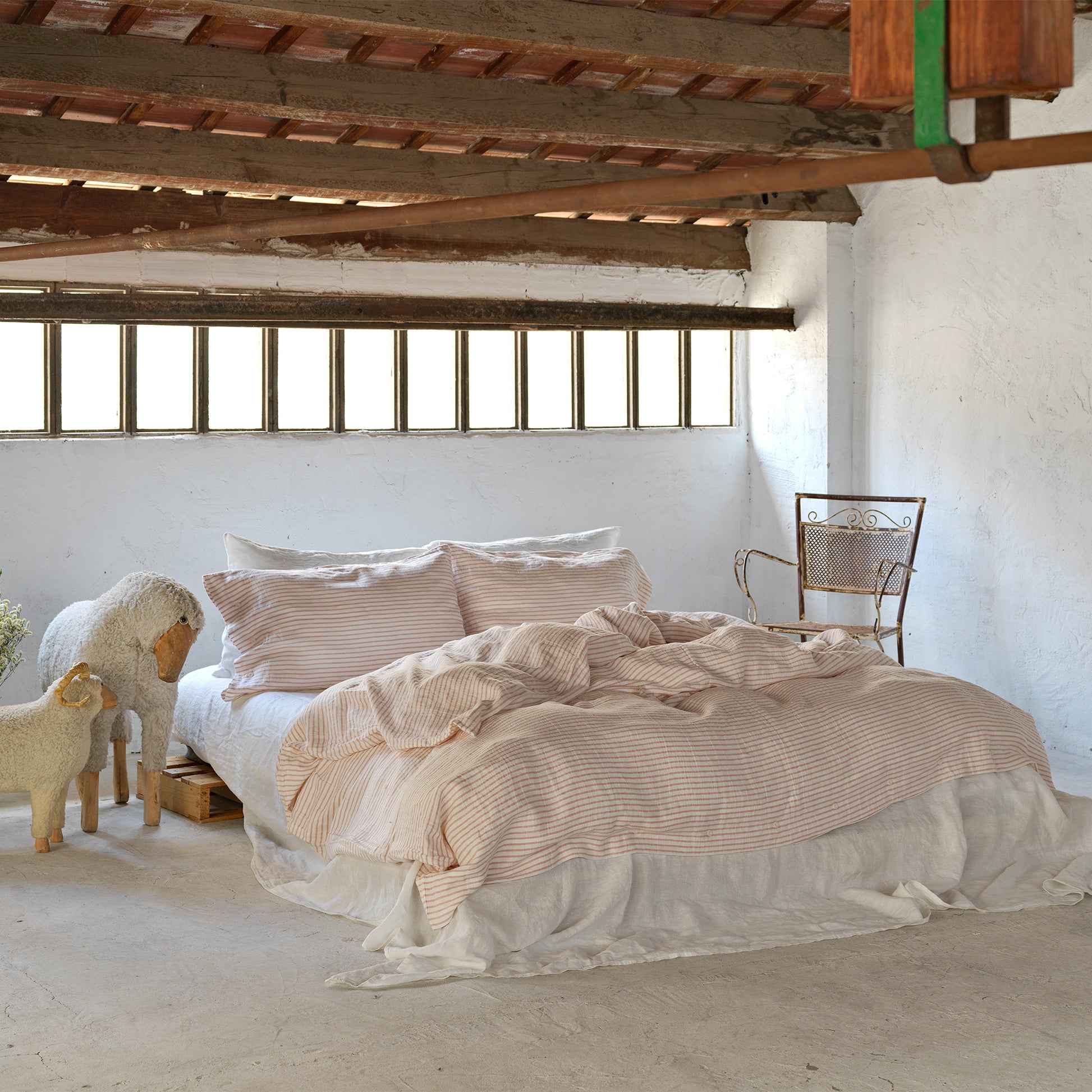 Este juego de cama rayado es ideal para combinarlo con la bajera de lino blanco y así puedes ir cambiando a la vez que puedes girarlo para tenerlo con la rayas finas o con las rayas mas gruesas.