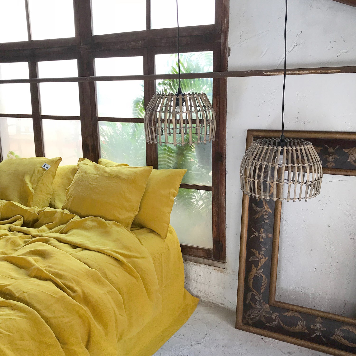 Un juego de cama hecho con 100% lino y en color mostaza. Combínalo colocando una sábana bajera blanca si no quieres verte una habitación muy cargada o si por el contrario eres de los que les gusta probar cosas diferentes y con algo más de carácter...prueba a combinarlo con una sábana bajera de lino negra.
