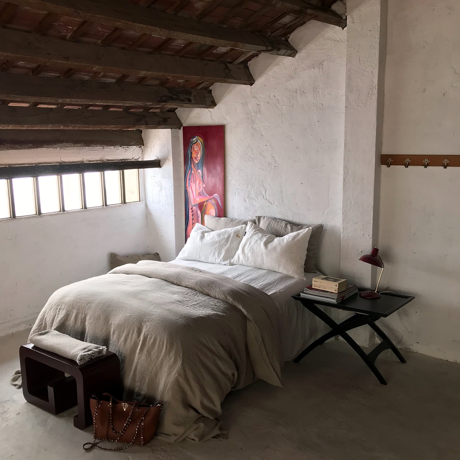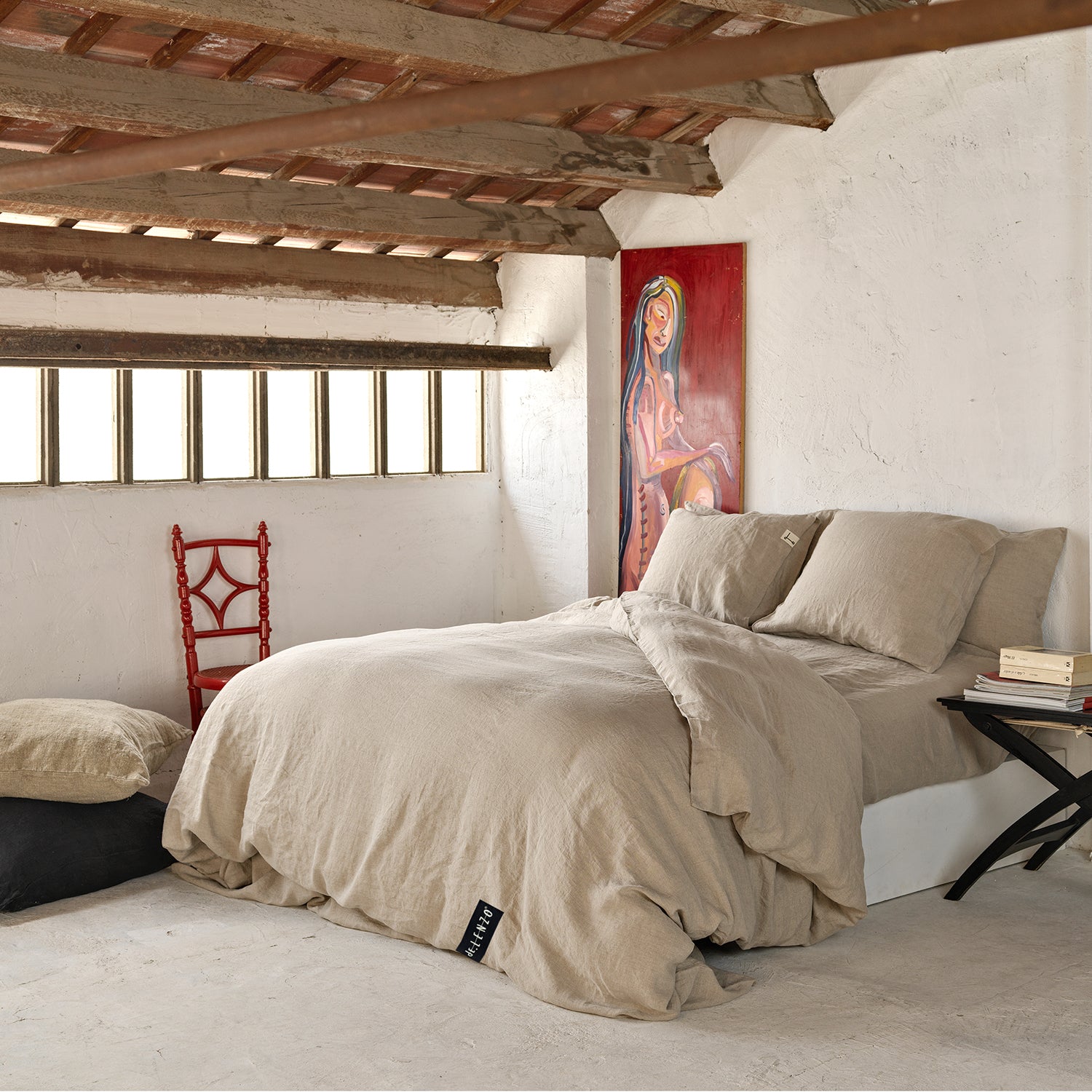 Juego de funda nórdica, fundas de almohada y sábana bajera ajustable de lino lavado. Este es un lino con cuerpo, peso medio y un tacto de lino inconfundible. El lino natural cambia mucho con la luz y con los lavados pues no tiene tinte, es un tejido natural.