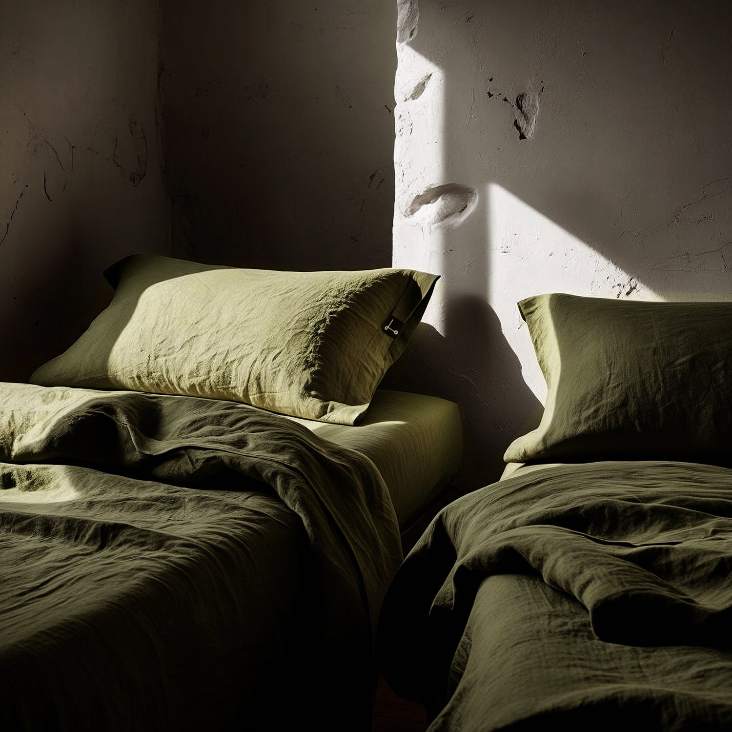 Juego de 100% lino verde, el verde de las olivas. Ideal para combinar con negros, camel y con linos de tonos naturales. Añade un acabado de puntada larga a tus almohadas.