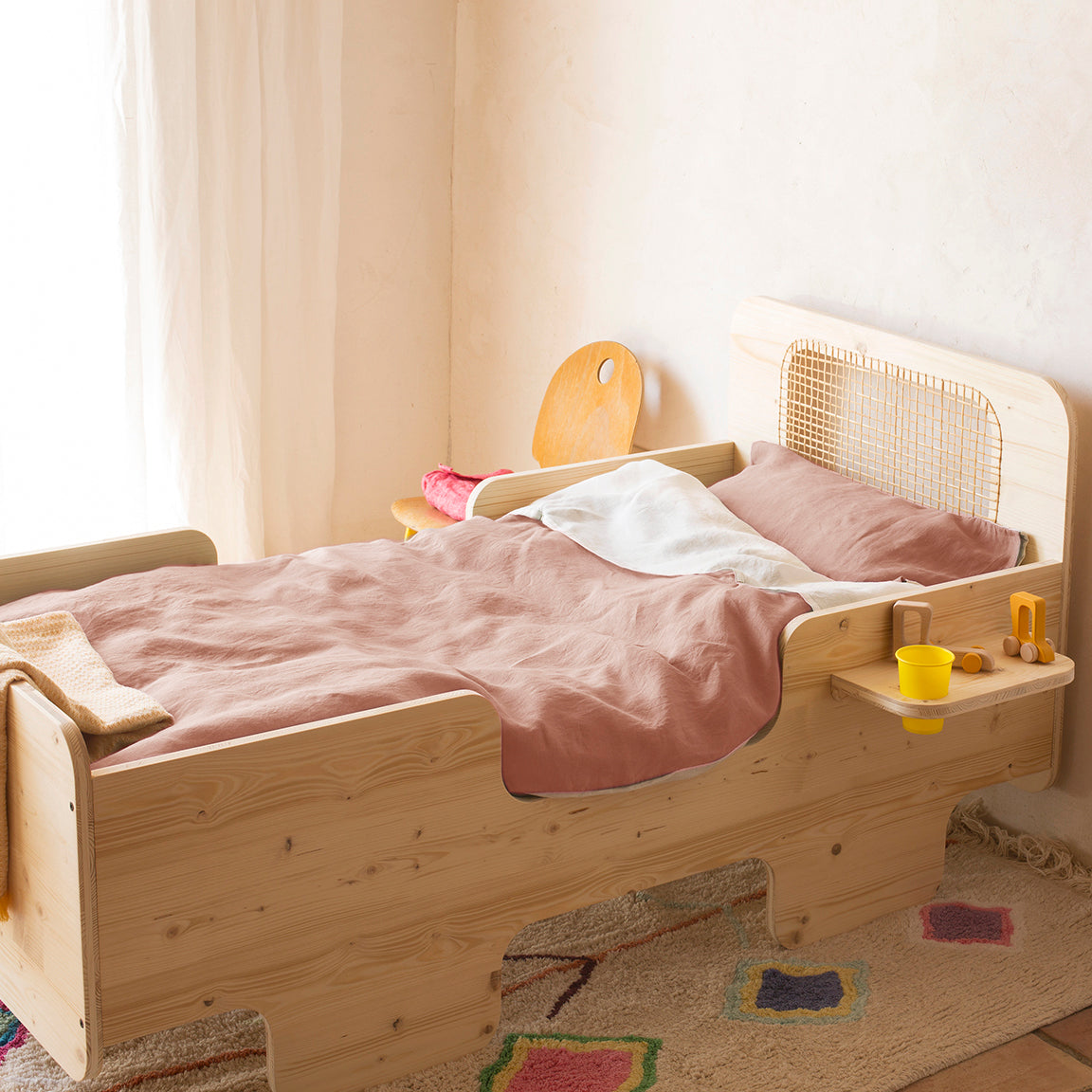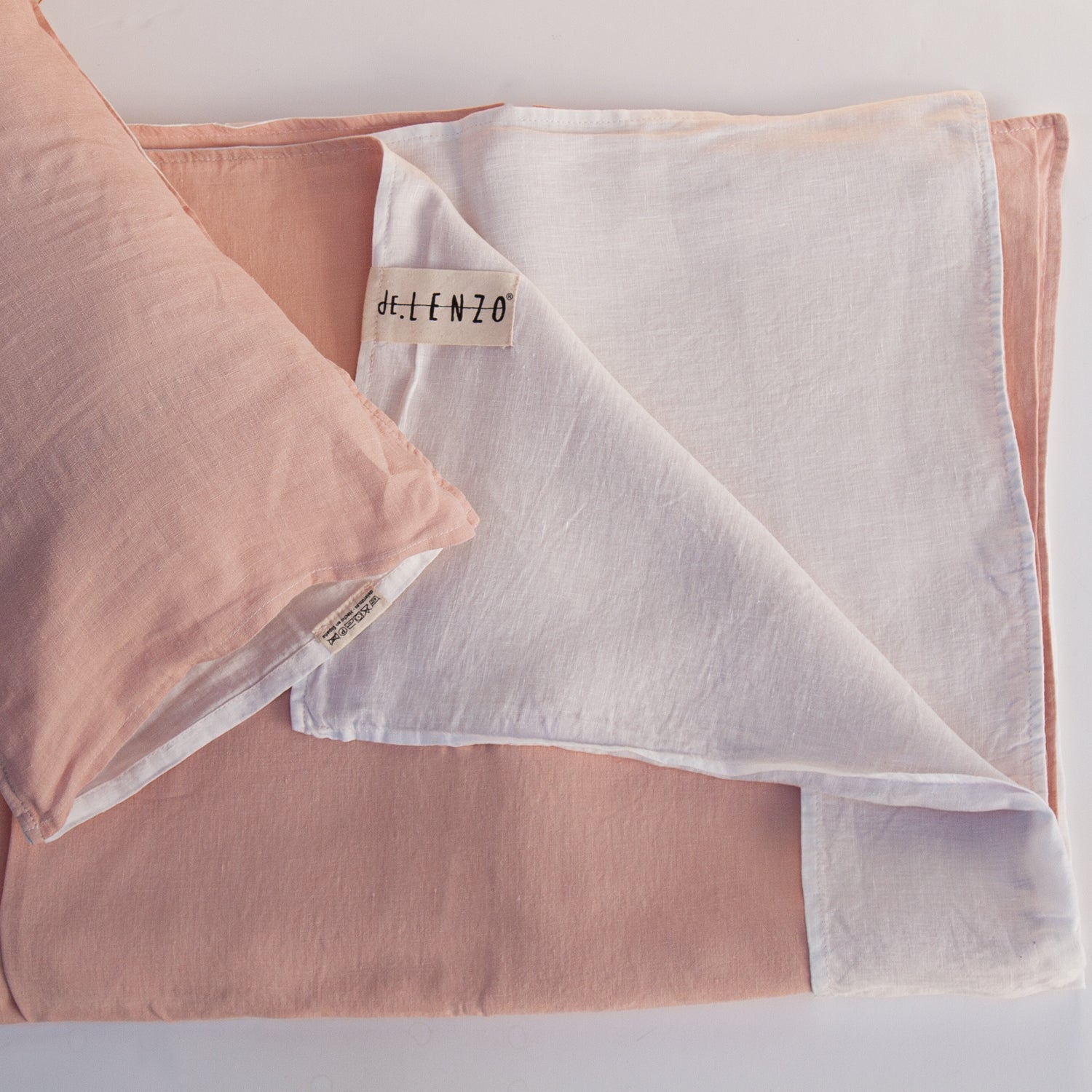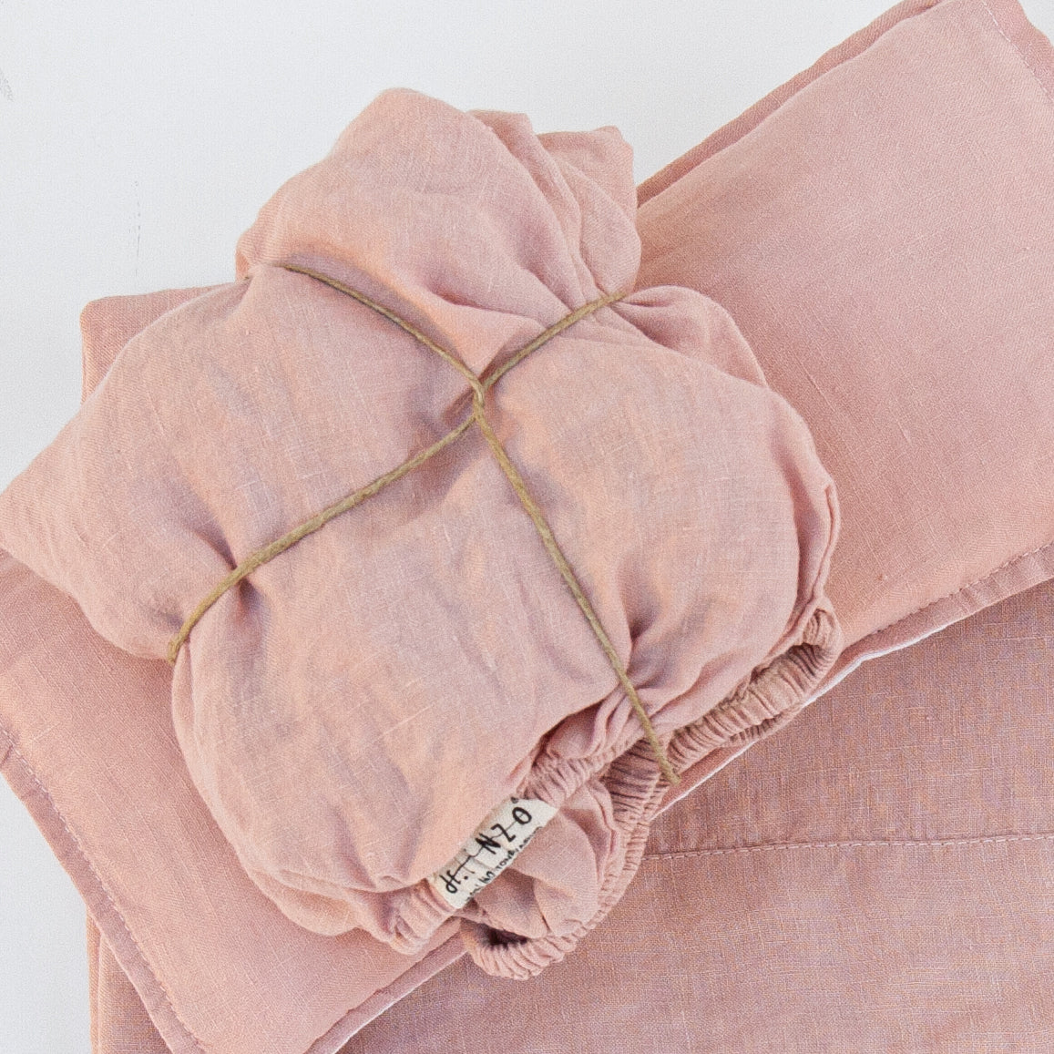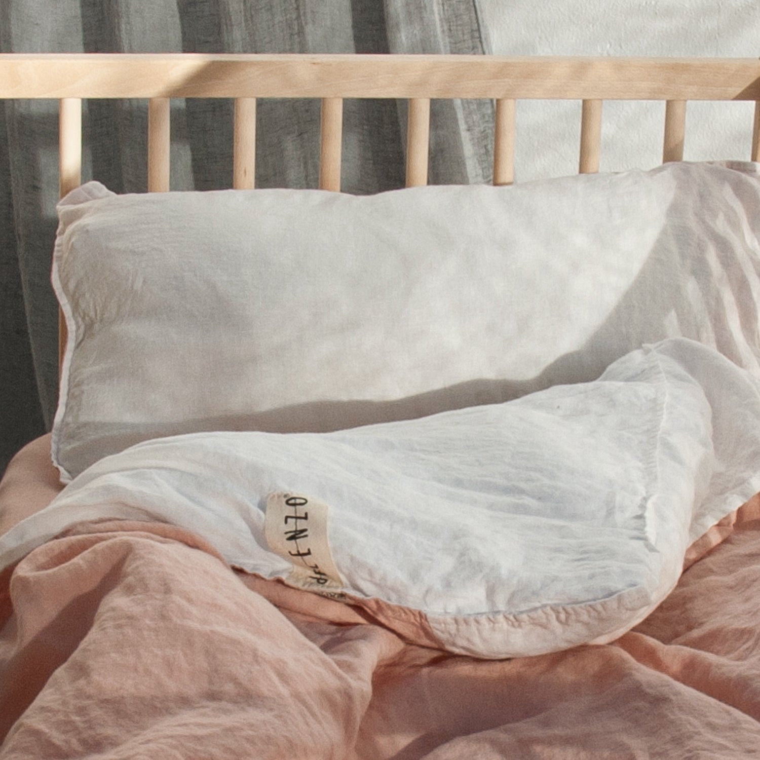 Nuestra funda nórdica Mafalda puede ser verde o rosa empolvado. Ambas están combinadas con blanco. Hechas de 100% lino, no necesitan planchado. El lino de un gramaje medio ( 170gr) es ideal para los más pequeños por su gran transpirabilidad. La funda de almohada lleva el relleno de fibra hueca incluido. En el juego completo (funda nórdica, bajera y almohada) la bajera es rosa como la funda nórdica.