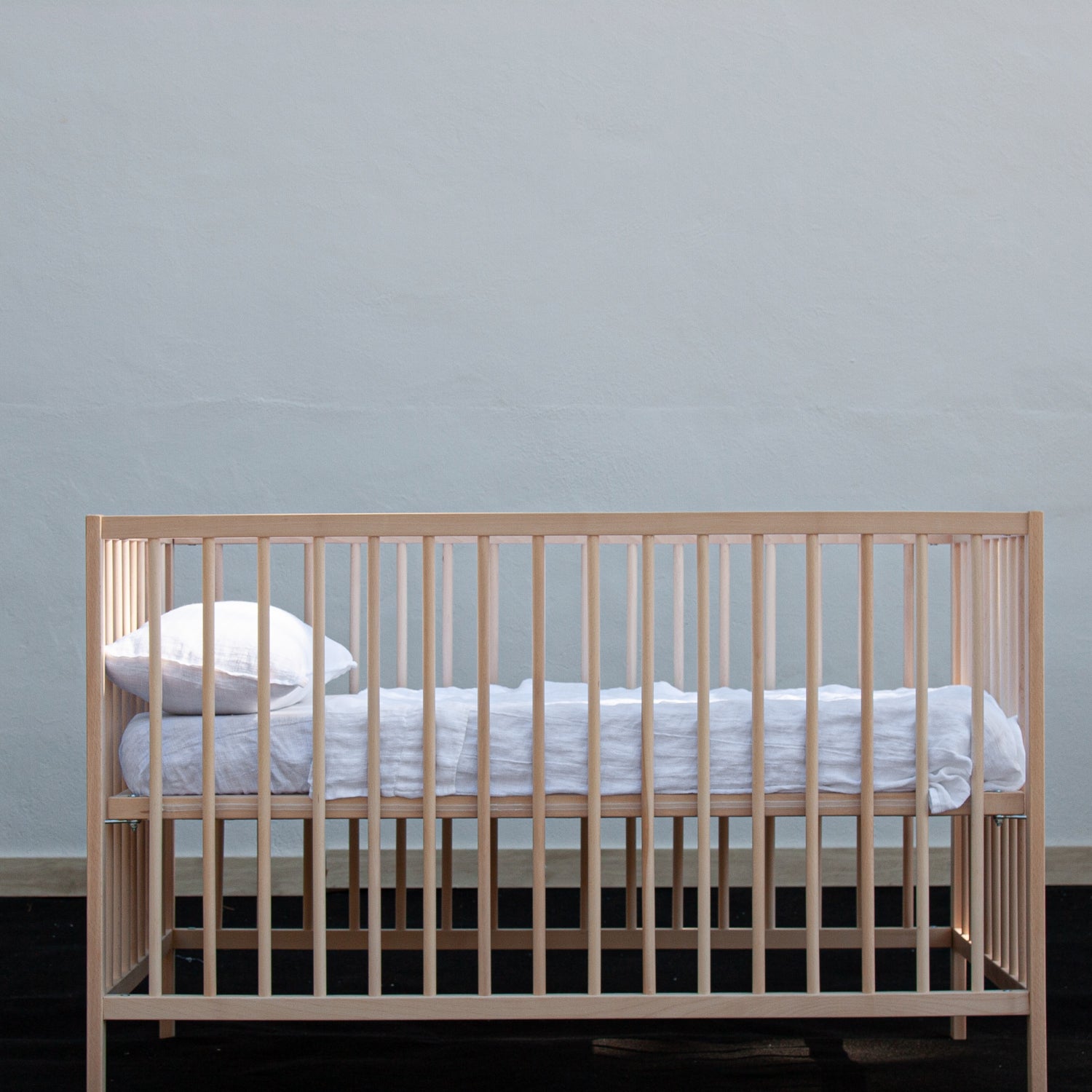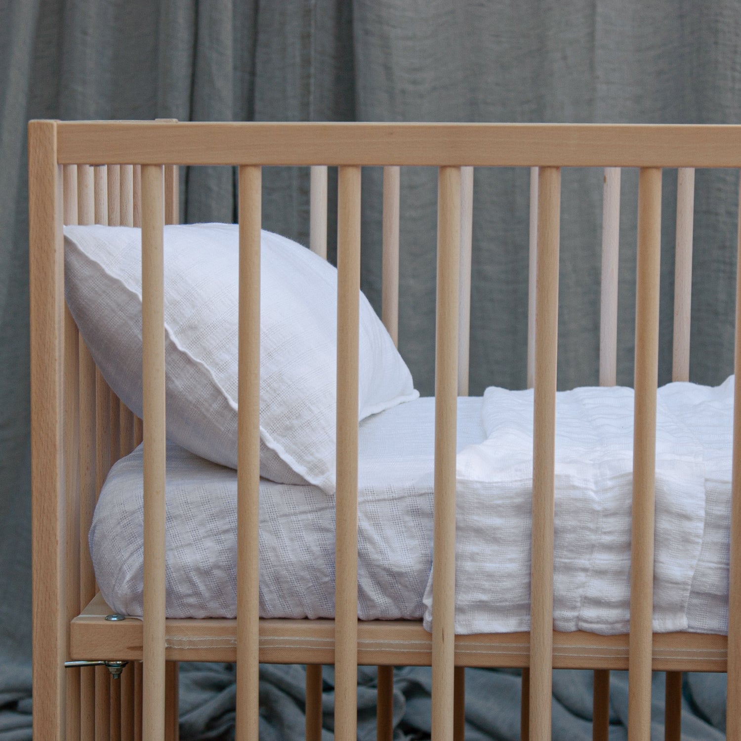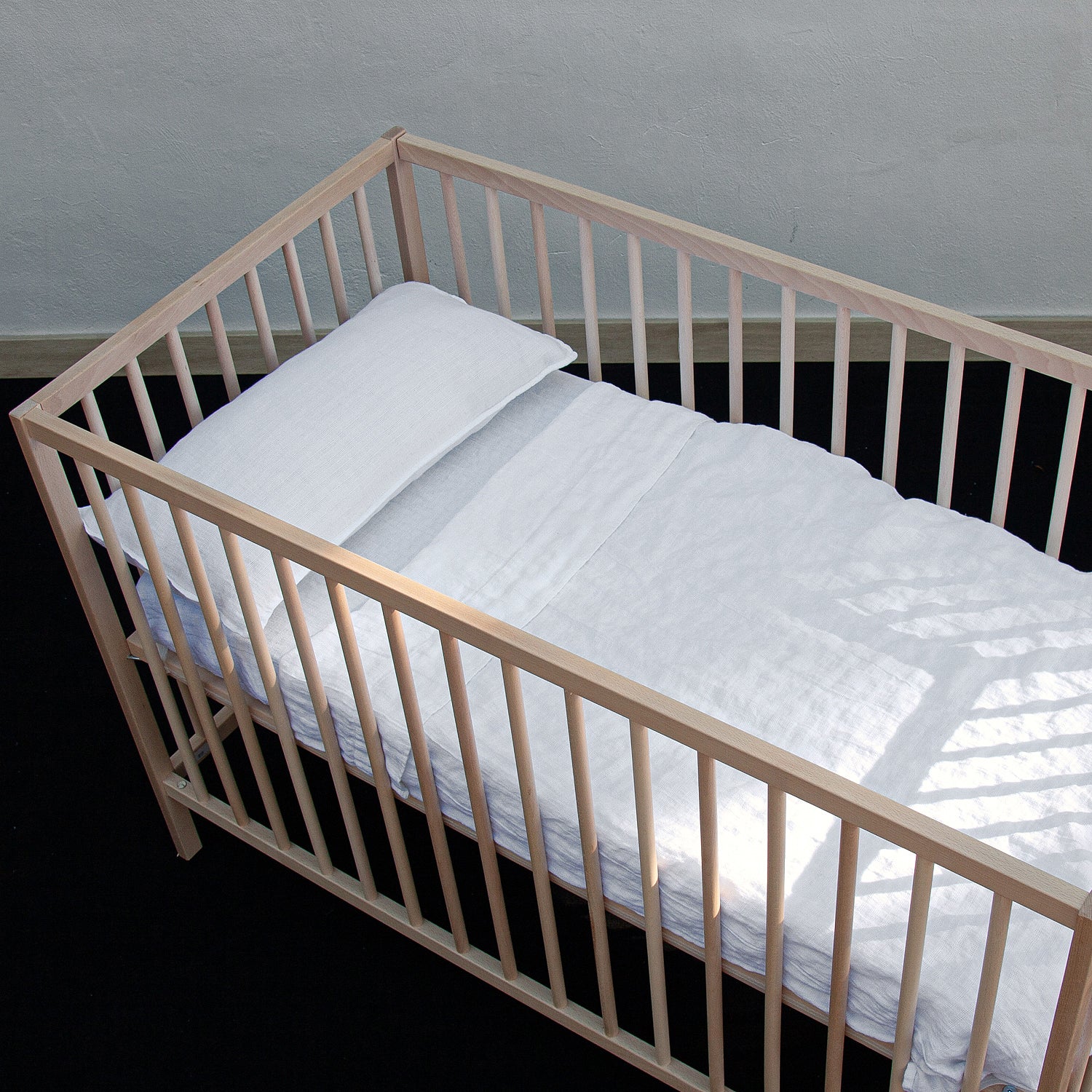 Juego de sábanas con funda de almohada para cuna 100% lino lavado en color blanco. Este modelo es muy dulce, es un básico super especial, único y muy diferente. Con un gramaje medio de 190gr este lino arropará su piel sin dejar que pase calor gracias a las propiedades termo reguladoras del lino.