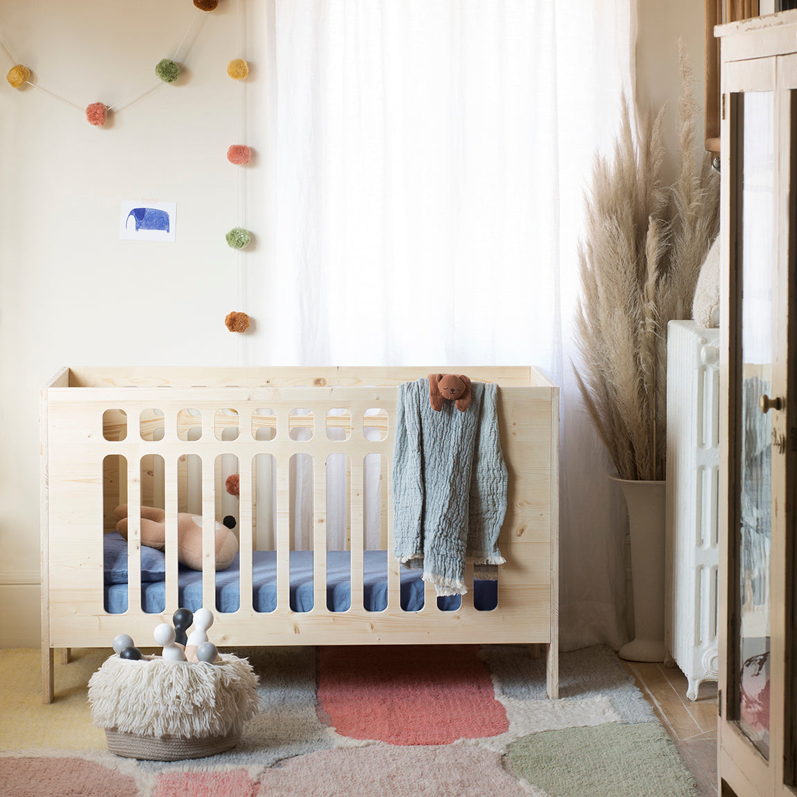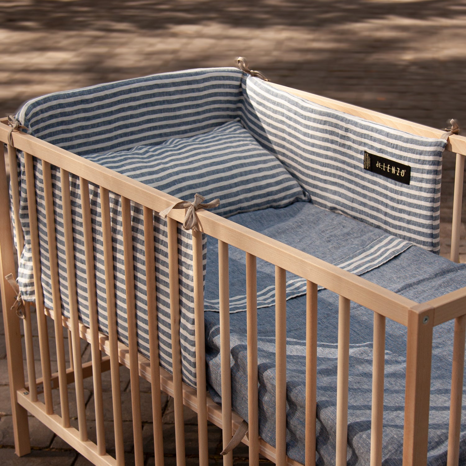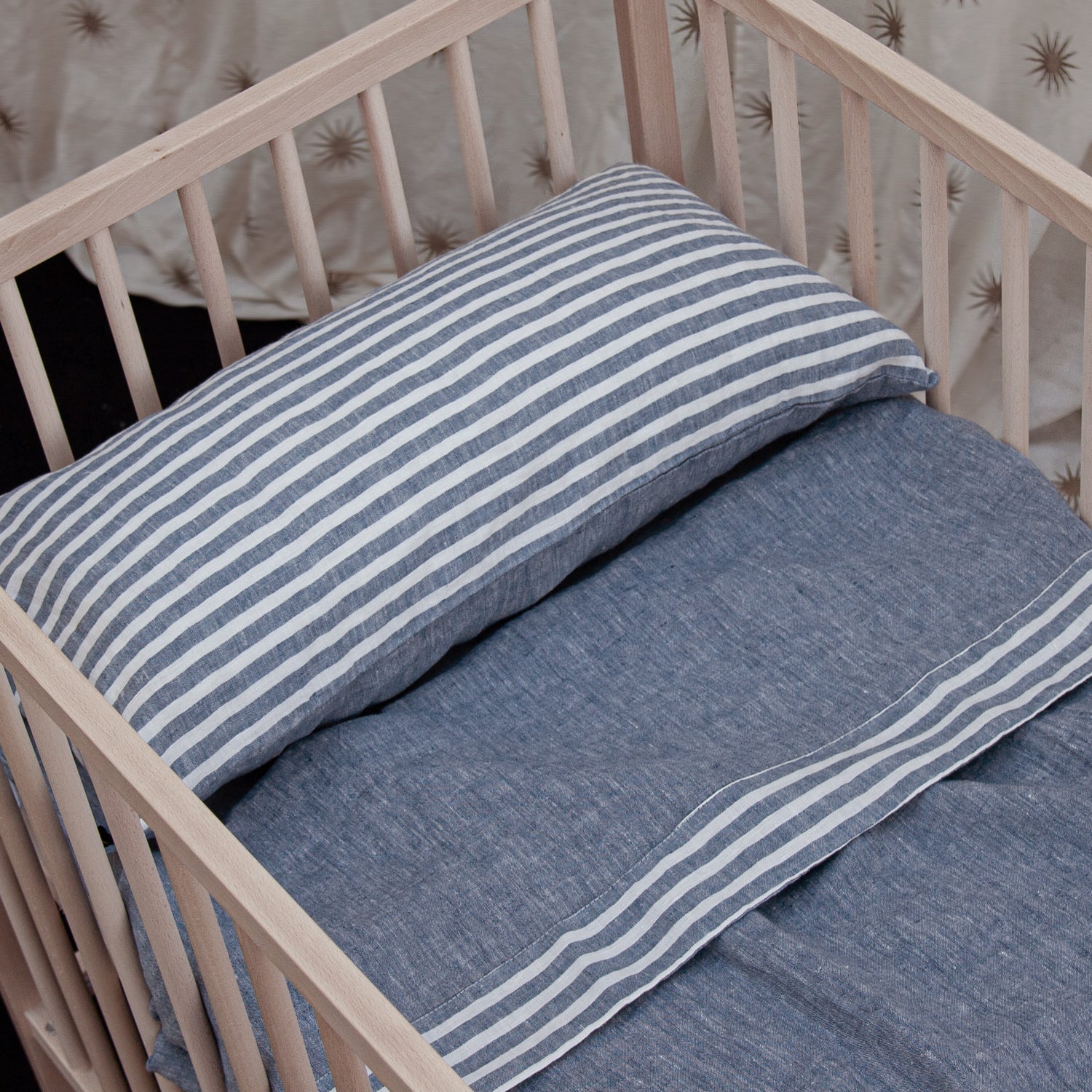 No podíamos tener a Gretel, sin Hansel. Para niños divertidos, estas sábanas de lino azul vaquero harán que tus hijos duerman de tirón arropados en la dulzura del lino. La encimera es azul y tiene un jaretón a rayas a juego con la funda de almohada (que es bicolor)