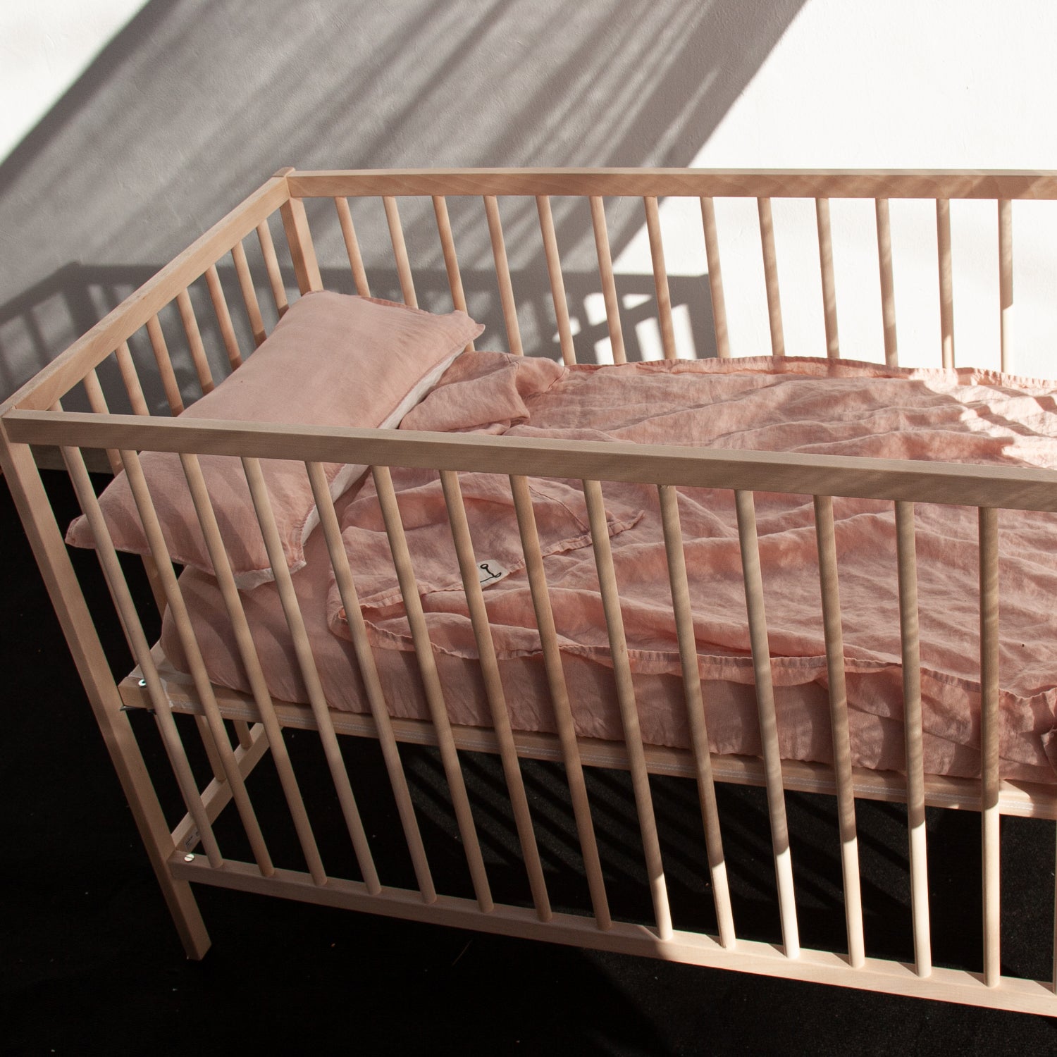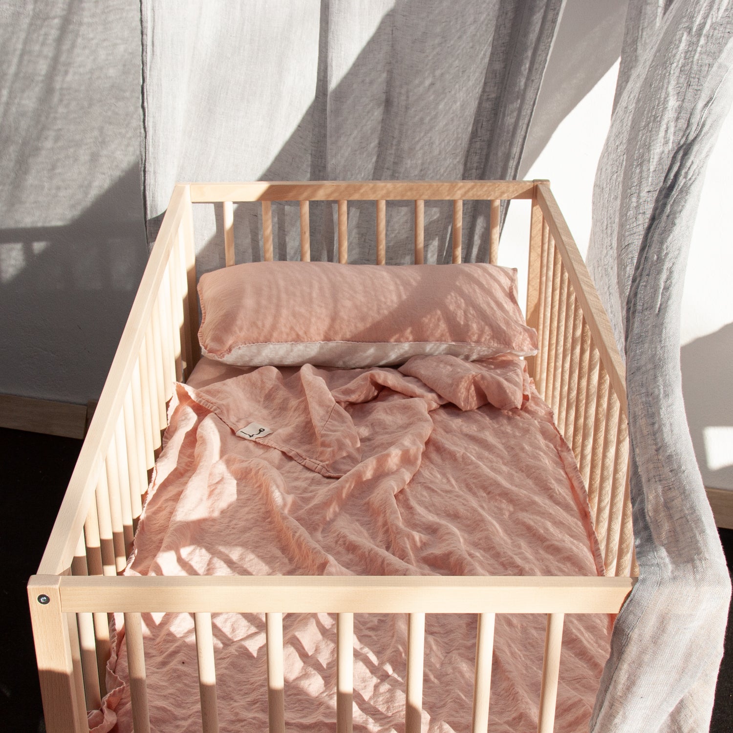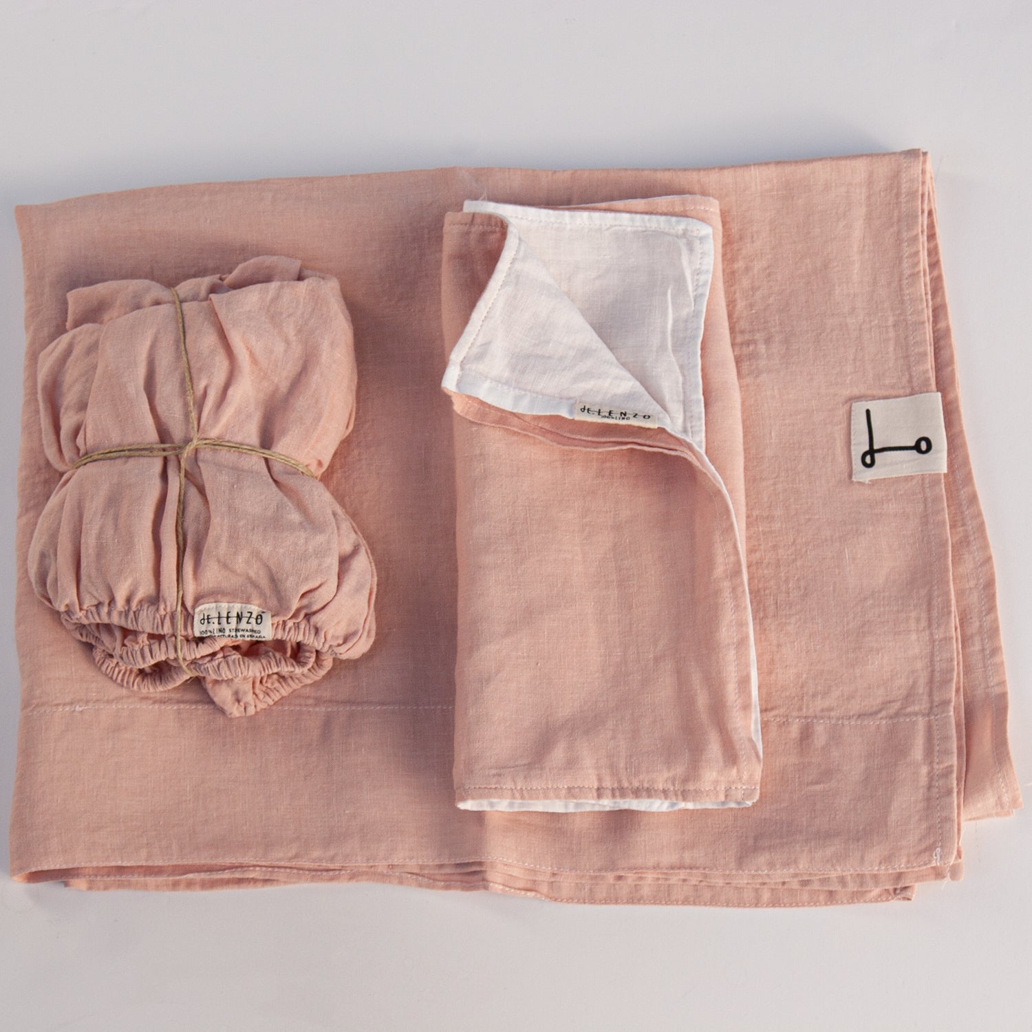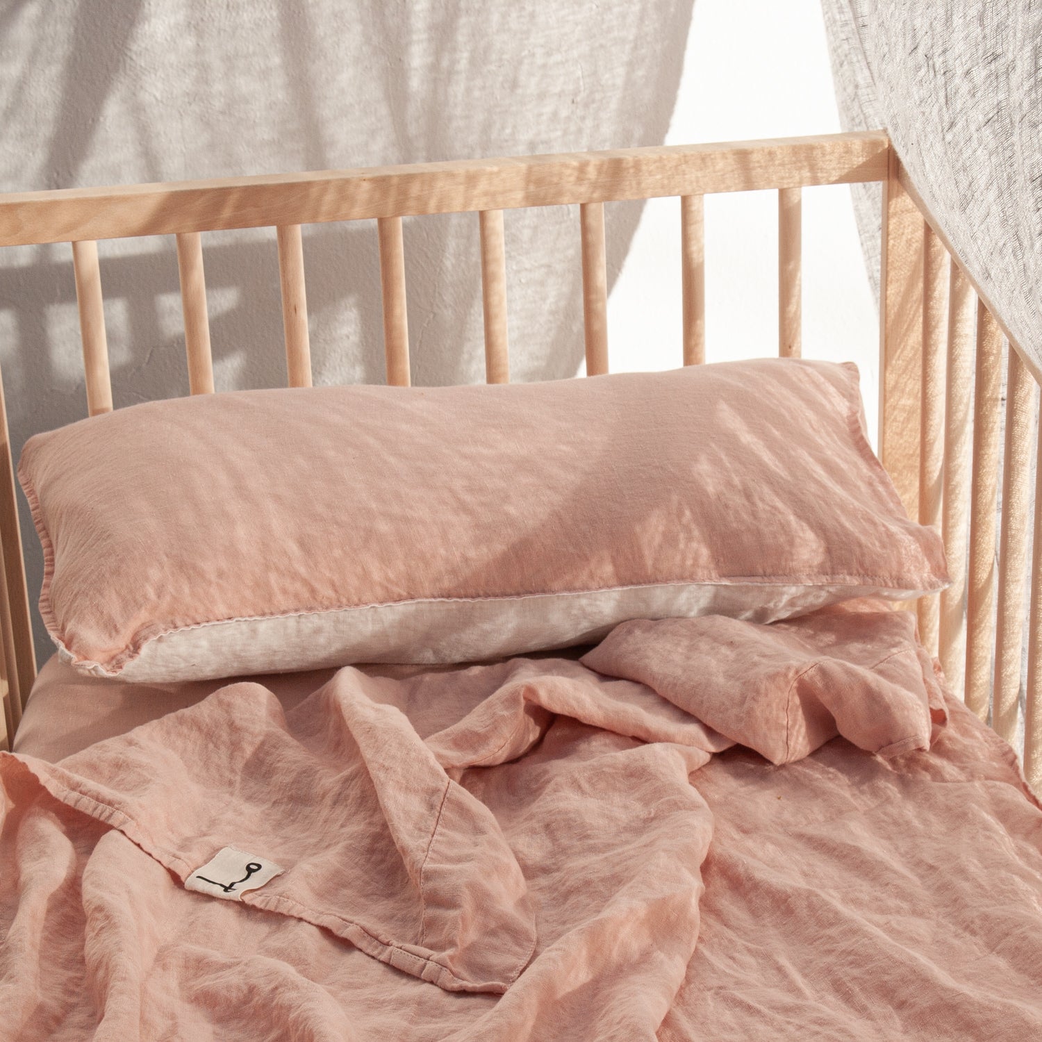El juego de sábanas incluye una funda de almohada todo 100% lino lavado. Nos chifla el color rosa empolvado de este modelo. La encimera es rosa confeccionada con jaretón y la funda de almohada es bicolor rosa y blanca ¡Un, dos, tres...decidido!