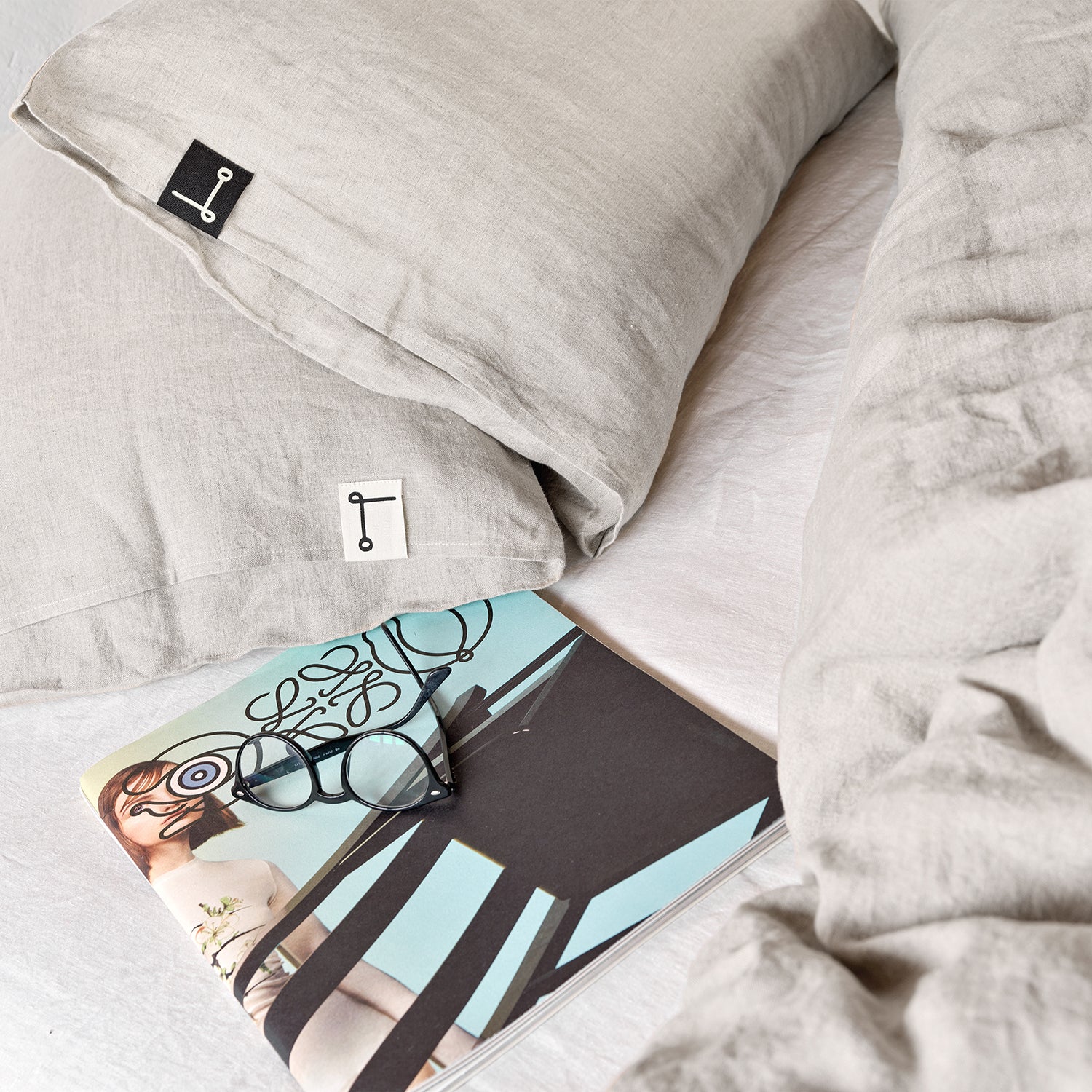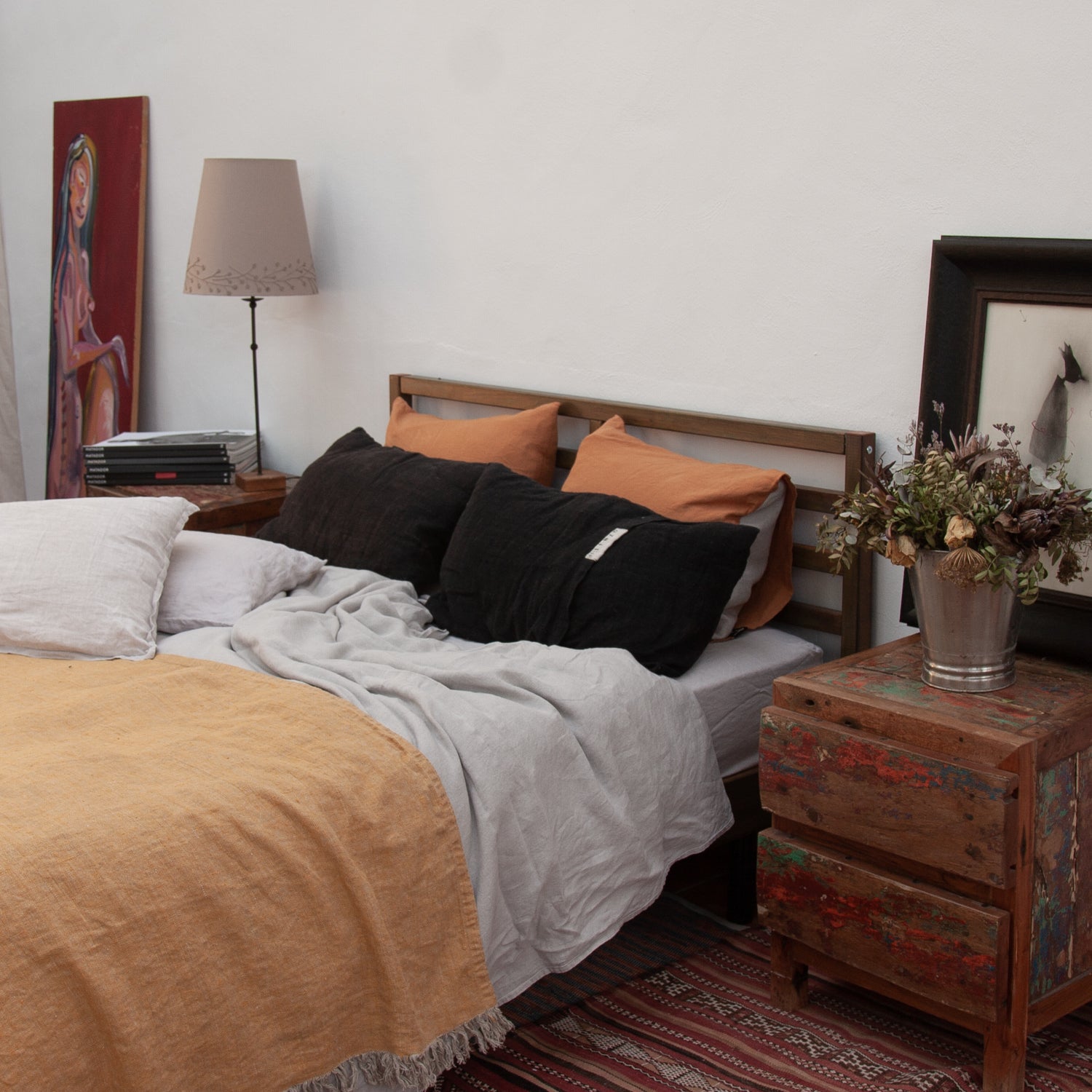 Juego de sábanas de lino de un color piedra, oscuro muy moderno. Un lino de color indefinido muy fresco y elegante con sus 170gr. Puedes elegir el tono claro o el oscuro.
