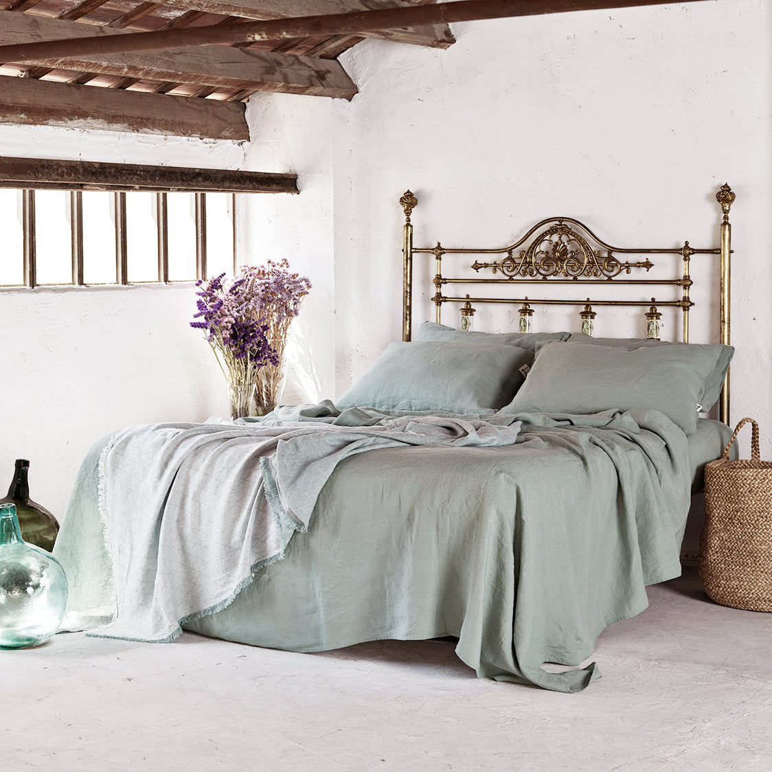 Juego de sábanas de lino lavado de color verde entre el verde reseda y el verde laurel. Un verde calmado y natural. Después lo puedes combinar con lino u otros tejidos de color blanco o linos naturales. Una combinación que te recordará al campo.