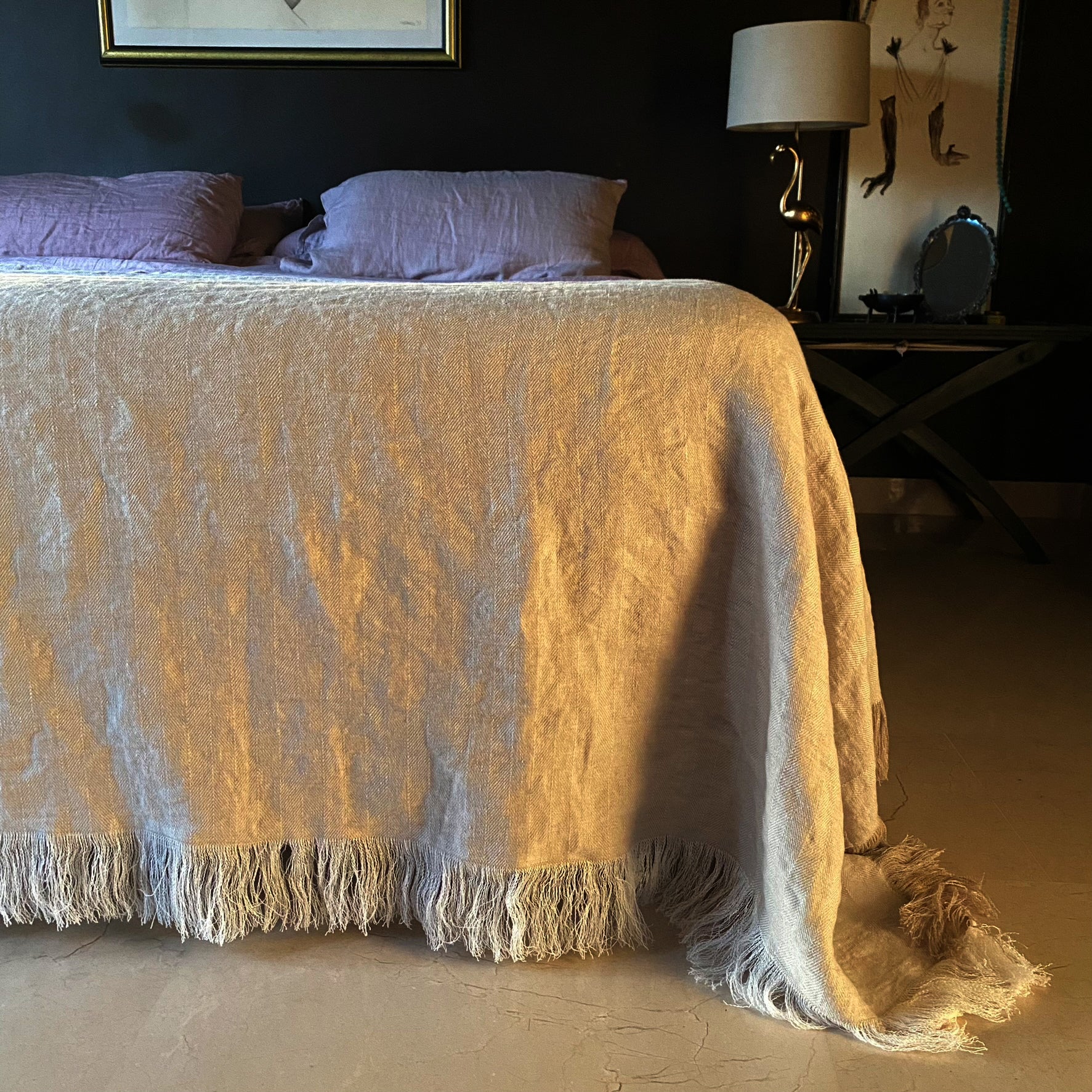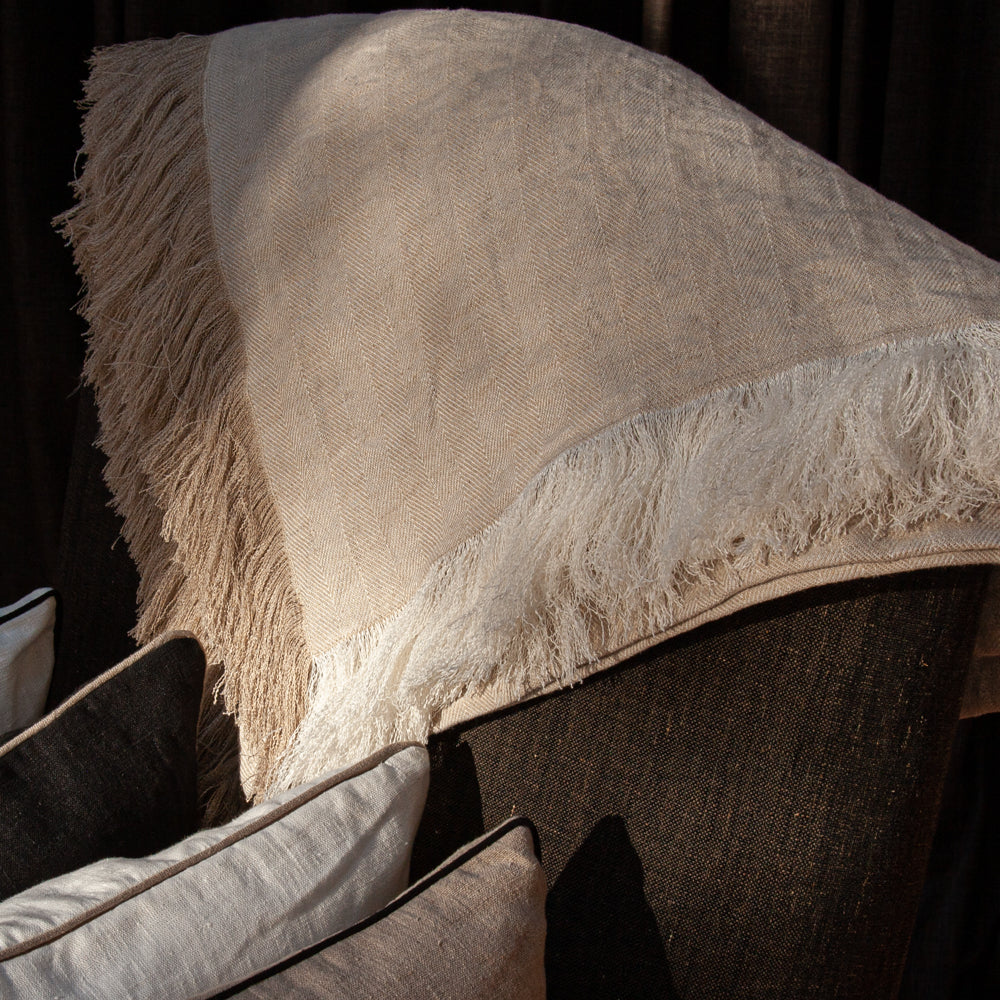 Algunos de nuestros cojines, están cosidos con lino rústico de hasta 350gr/m2, y nuestras toallas con rizo de lino y base de algodón, exfolian tu piel de la forma más natural posible.