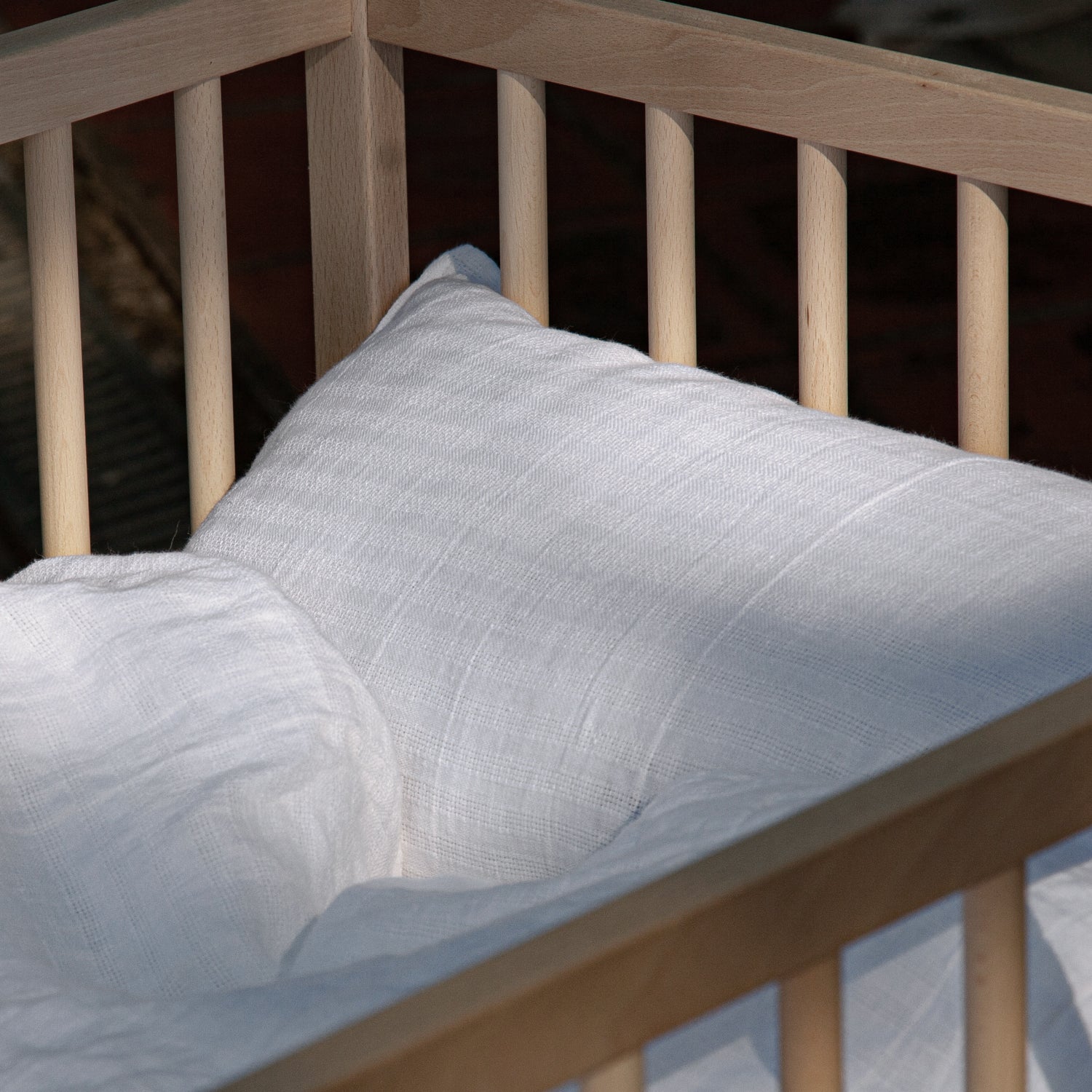 La ropa de cuna Aurora para cunas está confeccionada con un lino suave de un gramaje medio (190gr). Este lino está tejido con un dibujo suave que nos recuerda a los linos de antaño. Suave y dulce al tacto.