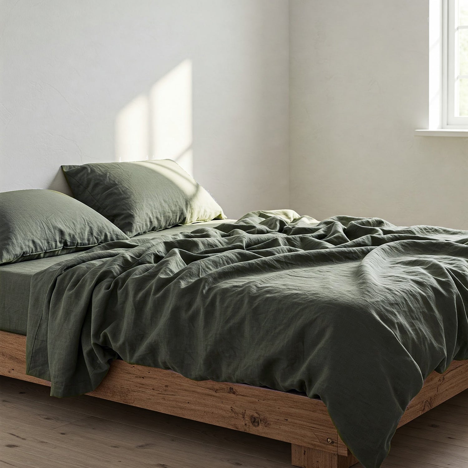 Sábana encimera de lino verde Capulet Olive. Combinable con casi todos los linos y colores.